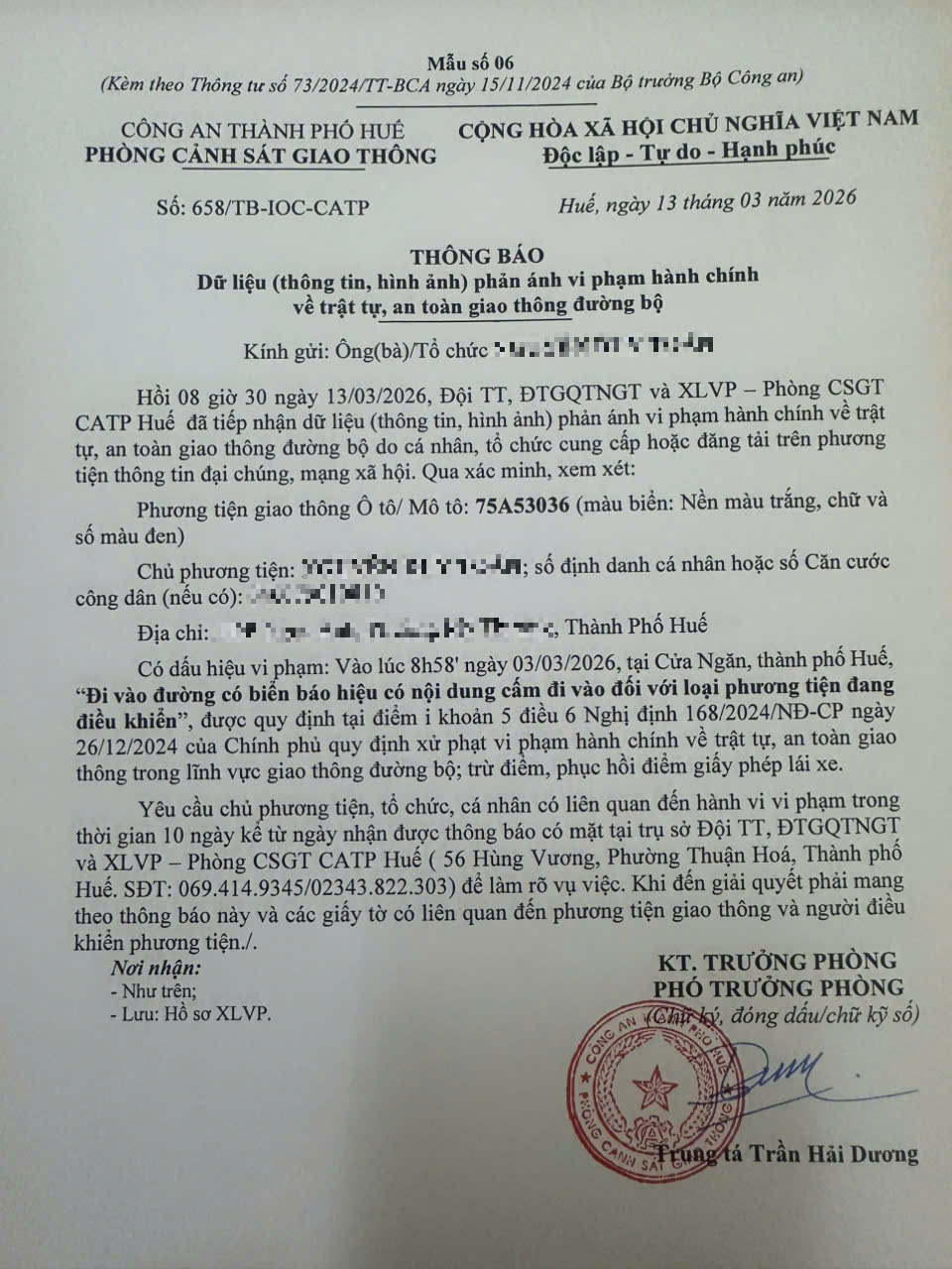 Qua hình ảnh phản ánh, người điều khiển phương tiện BKS 75A53036 có dấu hiệu vi phạm lỗi: Đi vào đường có biển báo hiệu có nội dung cấm đi vào đối với loại phương tiện đang điều khiển, quy định tại điểm i, khoản 5, điều 6 Nghị định số 168/2024/NĐ-CP ngày 26/12/2024 của Chính phủ quy định xử phạt vi phạm hành chính về trật tự, an toàn giao thông trong lĩnh vực giao thông đường bộ; trừ điểm, phục hồi điểm giấy phép lái xe.