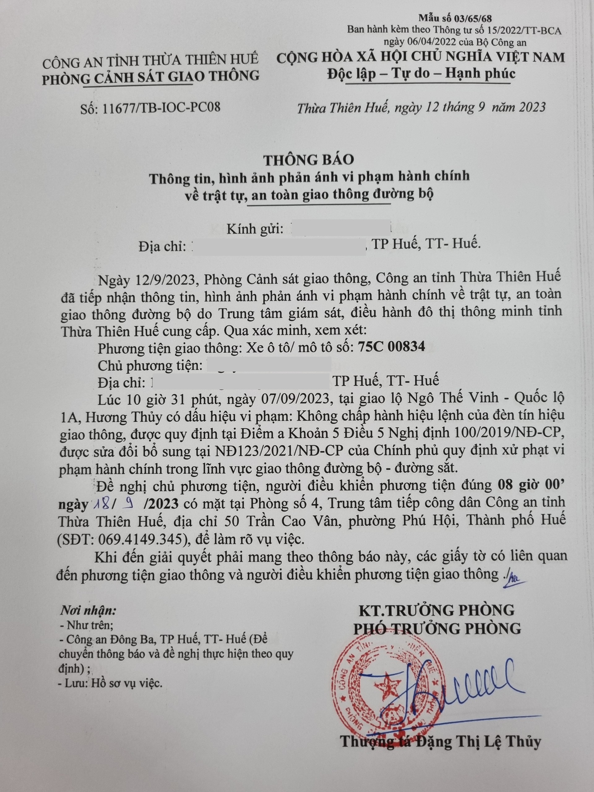 Phòng Cảnh sát giao thông đã lập hồ sơ, thông báo chủ phương tiện làm việc. Tuy nhiên, hiện chủ phương tiện vẫn chưa trình diện tại cơ quan. Phòng Cảnh sát giao thông sẽ gửi thông báo cho cơ quan đăng kiểm để đưa phương tiện vào cảnh báo trên Chương trình Quản lý kiểm định.