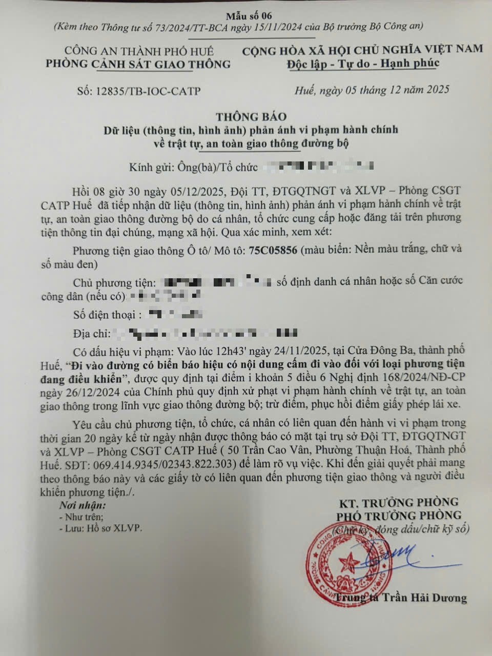 Qua hình ảnh phản ánh, Phòng Cảnh sát giao thông xác định lỗi vi phạm của người điều khiển phương tiện 75C05856 như sau: Đi vào đường có biển báo hiệu có nội dung cấm đi vào đối với loại phương tiện đang điều khiển, được quy định tại Điểm i khoản 5 Điều 6 Nghị định số 168/2024/NĐ-CP ngày 26/12/2024 của Chính phủ.