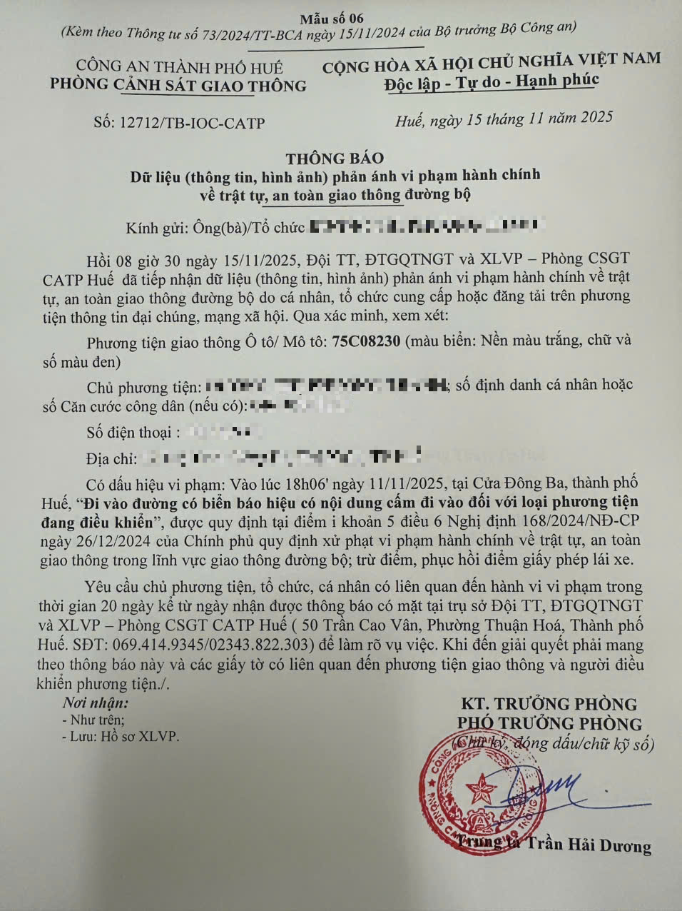Vấn đề quý Ông/Bà phản ánh, Phòng Cảnh sát giao thông – Công an thành phố Huế đã kiểm tra và xin thông báo kết quả như sau: