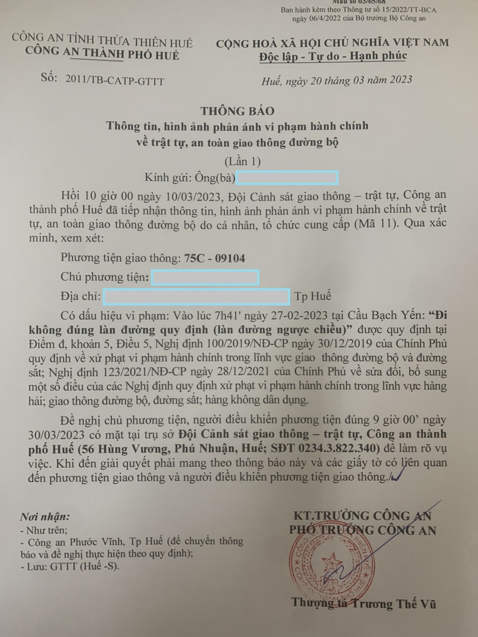 Vấn đề quý Ông/Bà phản ánh, Công an tỉnh đã chỉ đạo Công an thành phố Huế kiểm tra và xin thông báo kết quả xử lý như sau: