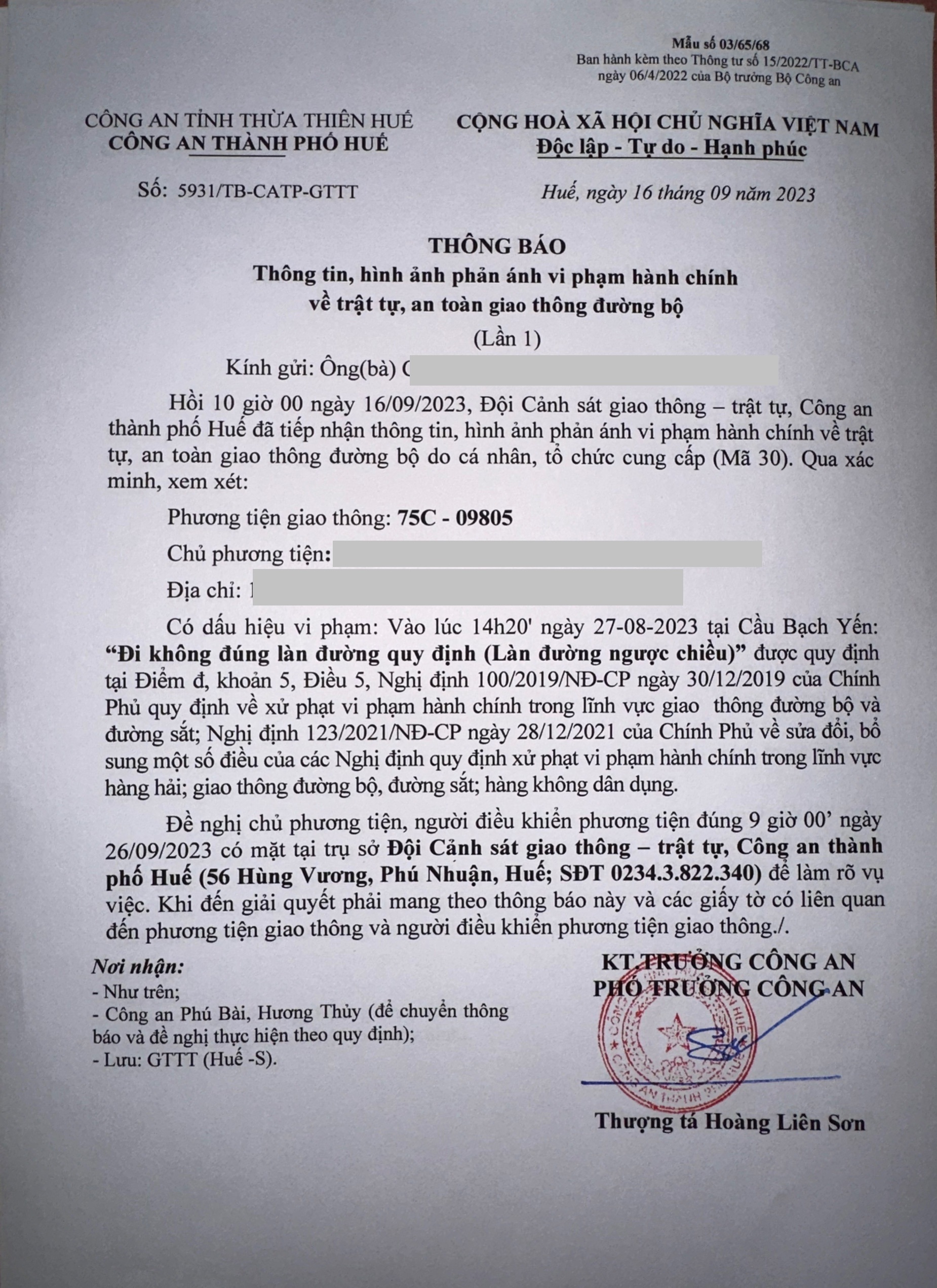Qua xác minh làm việc với chủ phương tiện vi phạm lỗi: Không chấp hành hiệu lệnh, chỉ dẫn của vạch kẻ đường, quy định tại điểm a, khoản 1, điều 5 Nghị định 100/2019/NĐ-CP được sửa đổi, bổ sung tại Nghị định 123/NĐ-CP ngày 28/12/2021. Ra Quyết định xử phạt 350.000đ. (Đính kèm Quyết định)