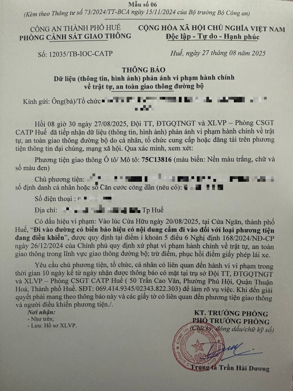 Phòng Cảnh sát giao thông đã xác minh, làm việc với chủ phương tiện 75C13816. Tại cơ quan, chủ phương tiện đã xem hình ảnh, công nhận vi phạm lỗi: Đi vào đường có biển báo hiệu có nội dung cấm đi vào đối với loại phương tiện đang điều khiển, quy định tại điểm i, khoản 5, điều 6 Nghị định số 168/2024/NĐ-CP ngày 26/12/2024 của Chính phủ, đồng thời cam kết không tái phạm.