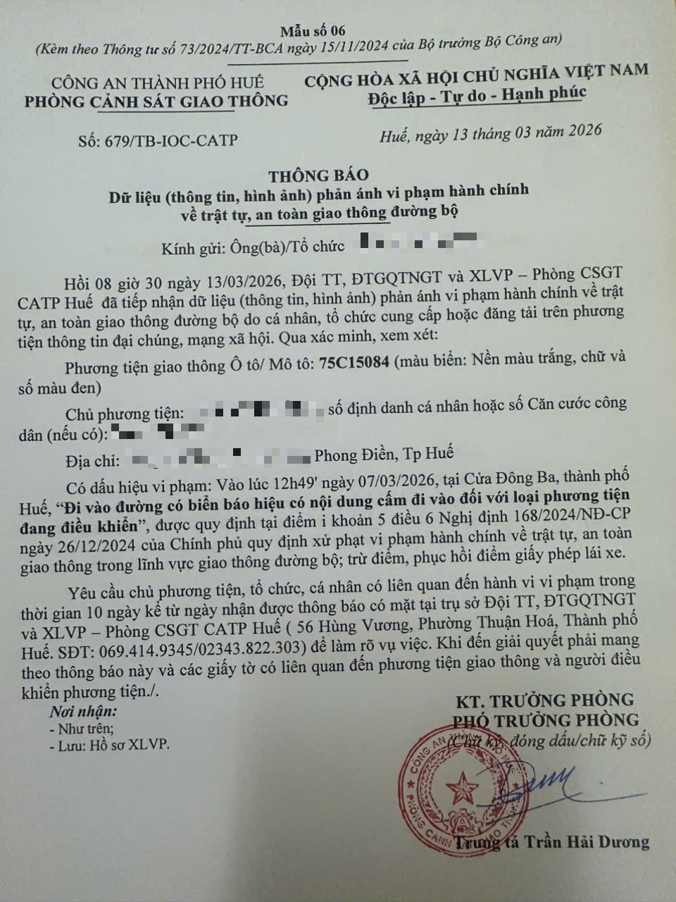 Vấn đề quý Ông/Bà phản ánh, Phòng Cảnh sát giao thông – Công an thành phố Huế đã kiểm trả và xin thông báo kết quả như sau: