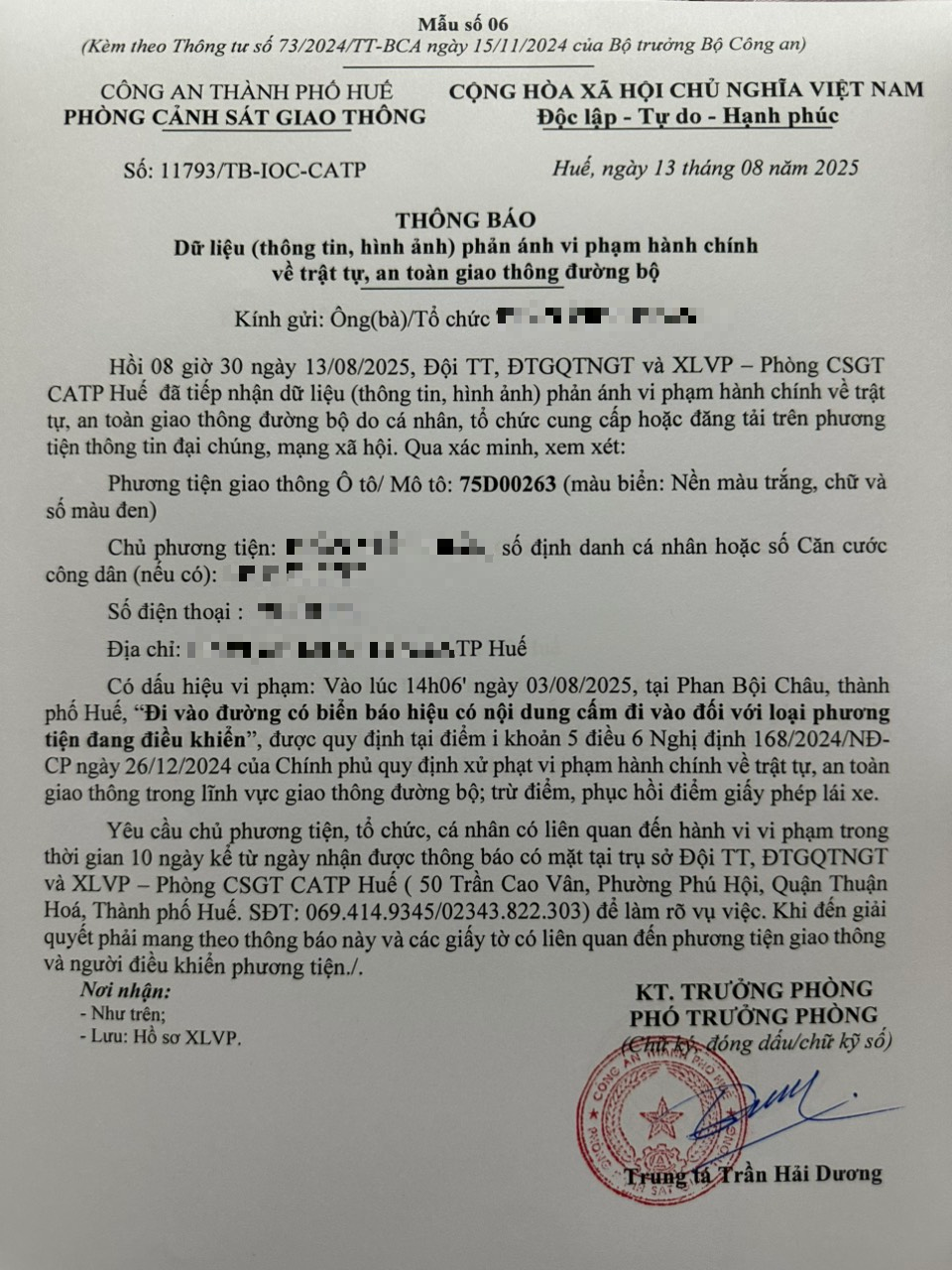 Vấn đề quý Ông/Bà phản ánh, Phòng Cảnh sát giao thông – Công an thành phố Huế đã kiểm tra và xin thông báo kết quả như sau: