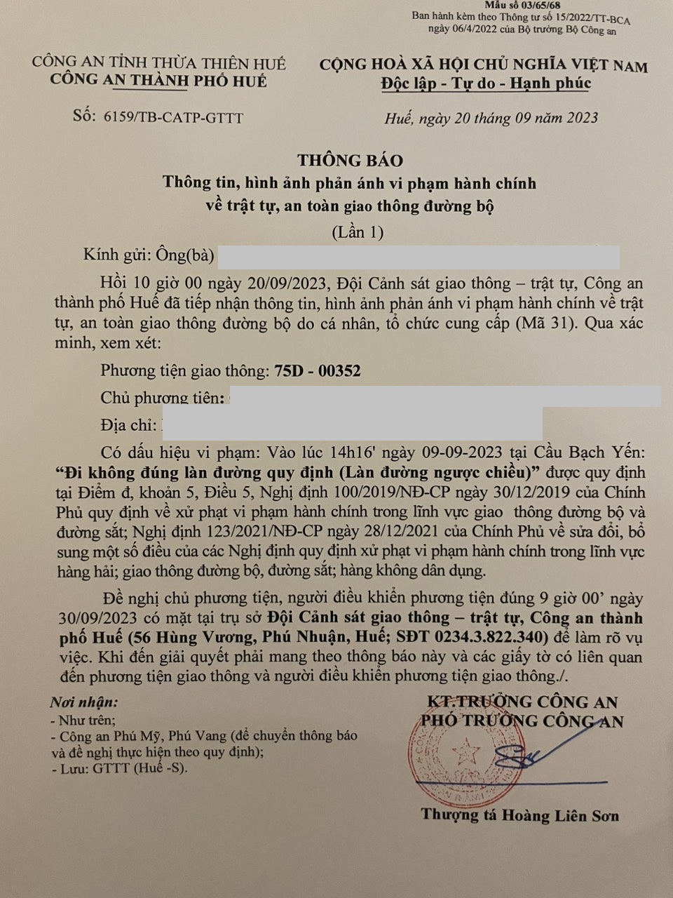 Vấn đề quý Ông/Bà phản ánh, Công an tỉnh đã chỉ đạo Công an thành phố Huế kiểm tra và xin thông báo kết quả như sau: