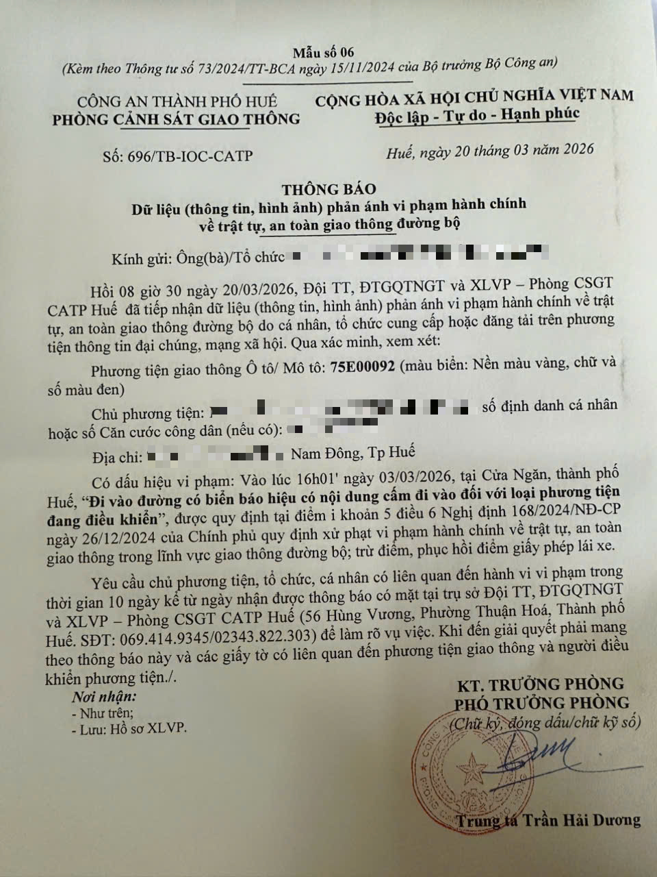 Vấn đề quý Ông/Bà phản ánh, Phòng Cảnh sát giao thông – Công an thành phố Huế đã kiểm trả và xin thông báo kết quả như sau: