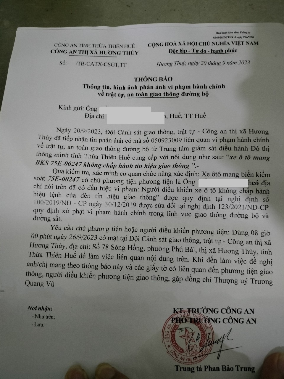 Công an thị xã Hương Thuỷ đã xác minh, làm rõ xe ô tô BKS 75E00247 vi phạm lỗi: "Không chấp hành hiệu lệnh của đèn tín hiệu giao thông" quy định tại điểm a Khoản 5, Điều 5 Nghị định 100/2019/NĐ-CP, sửa đổi bổ sung tại Nghị định 123/2021/NĐ-CP của Chính phủ.