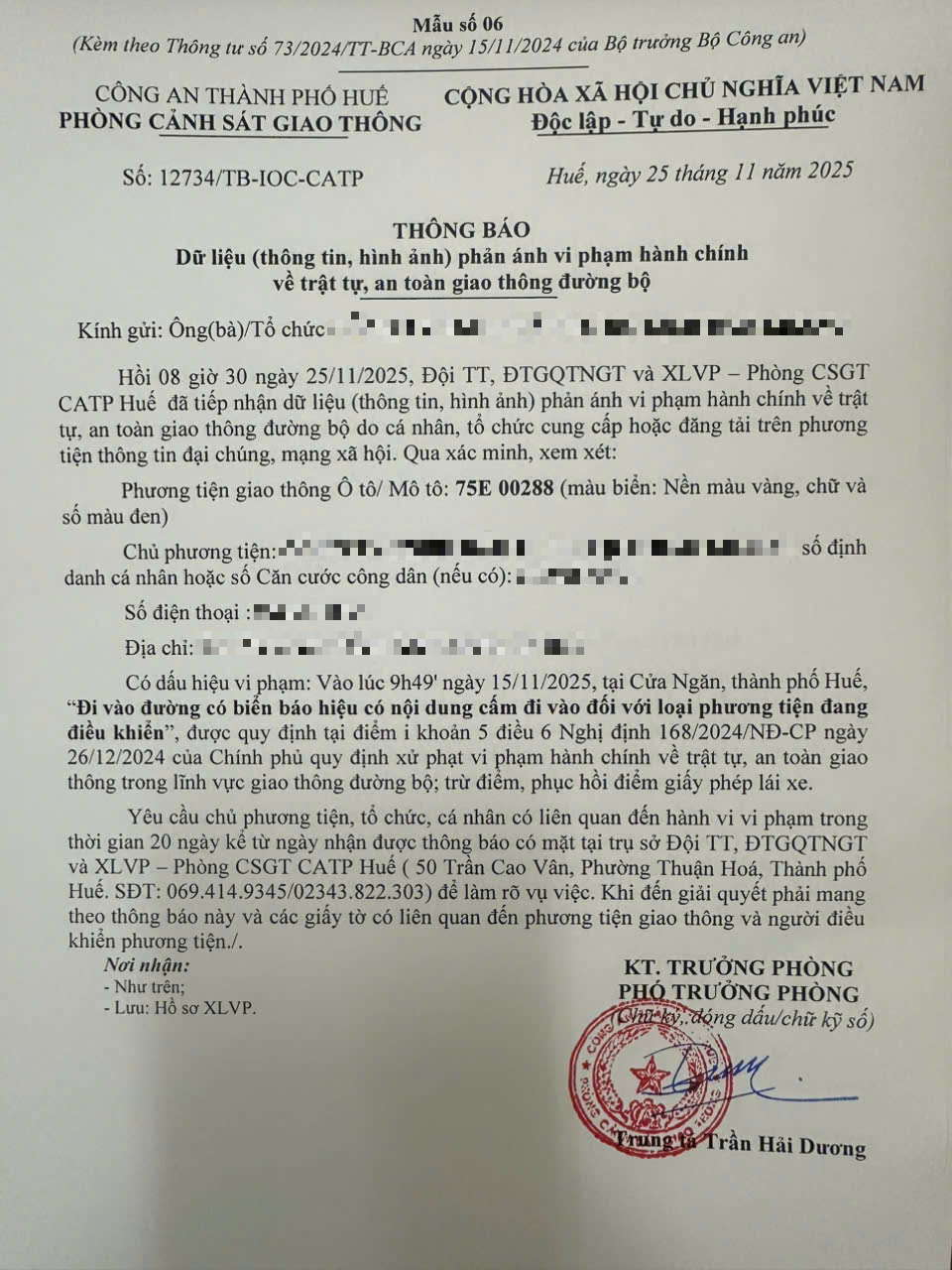 Vào lúc 09 giờ 49 phút, ngày 15/11/2025 ô tô mang biển kiểm soát 75E00288 đi vào đường cấm, giờ cấm khi tham gia giao thông tại Cửa Ngăn 1