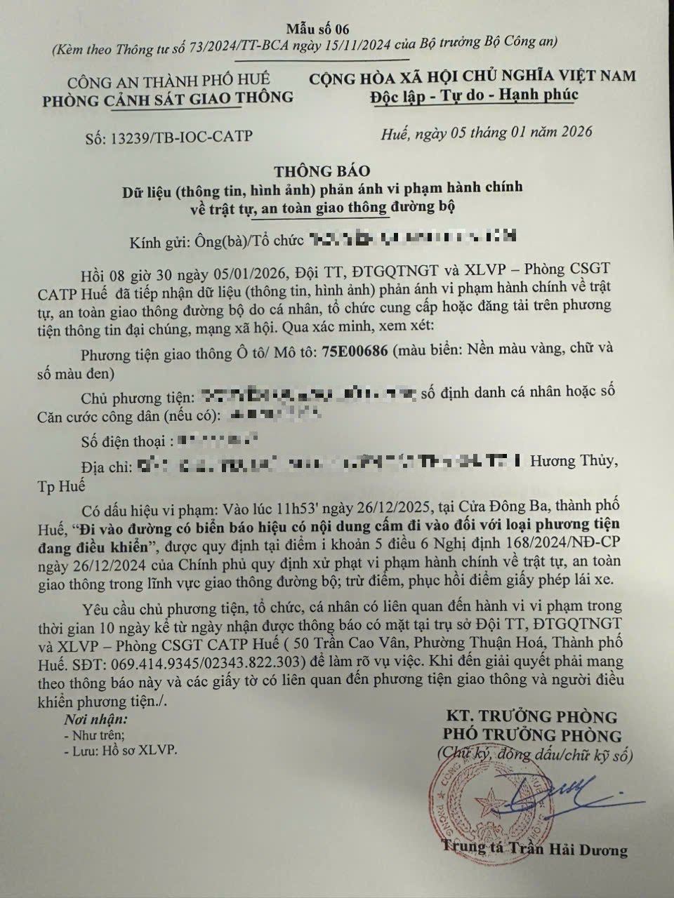 Qua hình ảnh phản ánh, Phòng Cảnh sát giao thông xác định lỗi vi phạm của người điều khiển phương tiện 75E00686 như sau: Đi vào đường có biển báo hiệu có nội dung cấm đi vào đối với loại phương tiện đang điều khiển, được quy định tại Điểm i khoản 5 Điều 6 Nghị định số 168/2024/NĐ-CP ngày 26/12/2024 của Chính phủ.