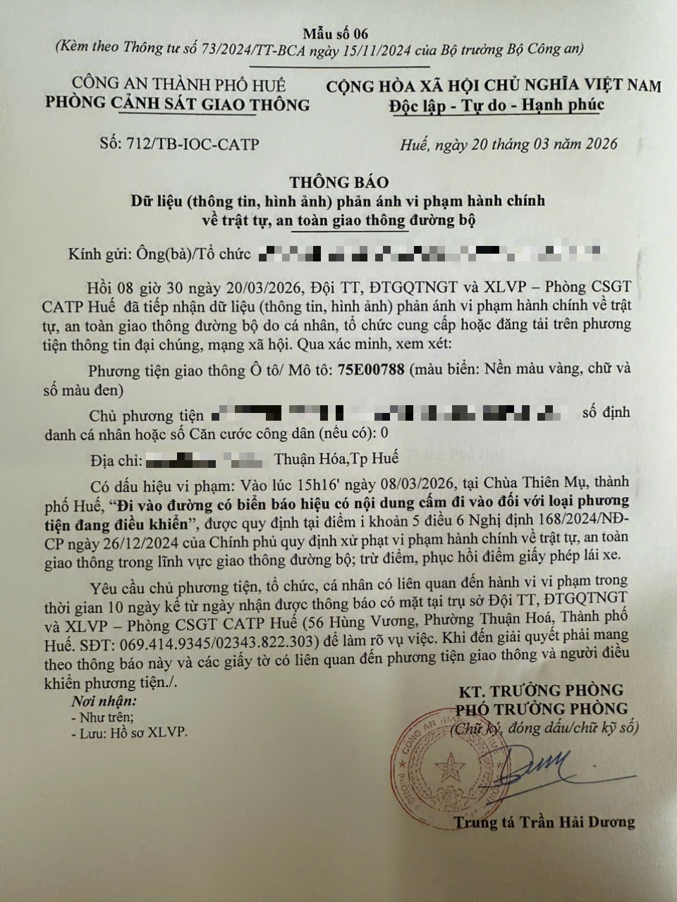 Vấn đề quý Ông/Bà phản ánh, Phòng Cảnh sát giao thông – Công an thành phố Huế đã kiểm trả và xin thông báo kết quả như sau: