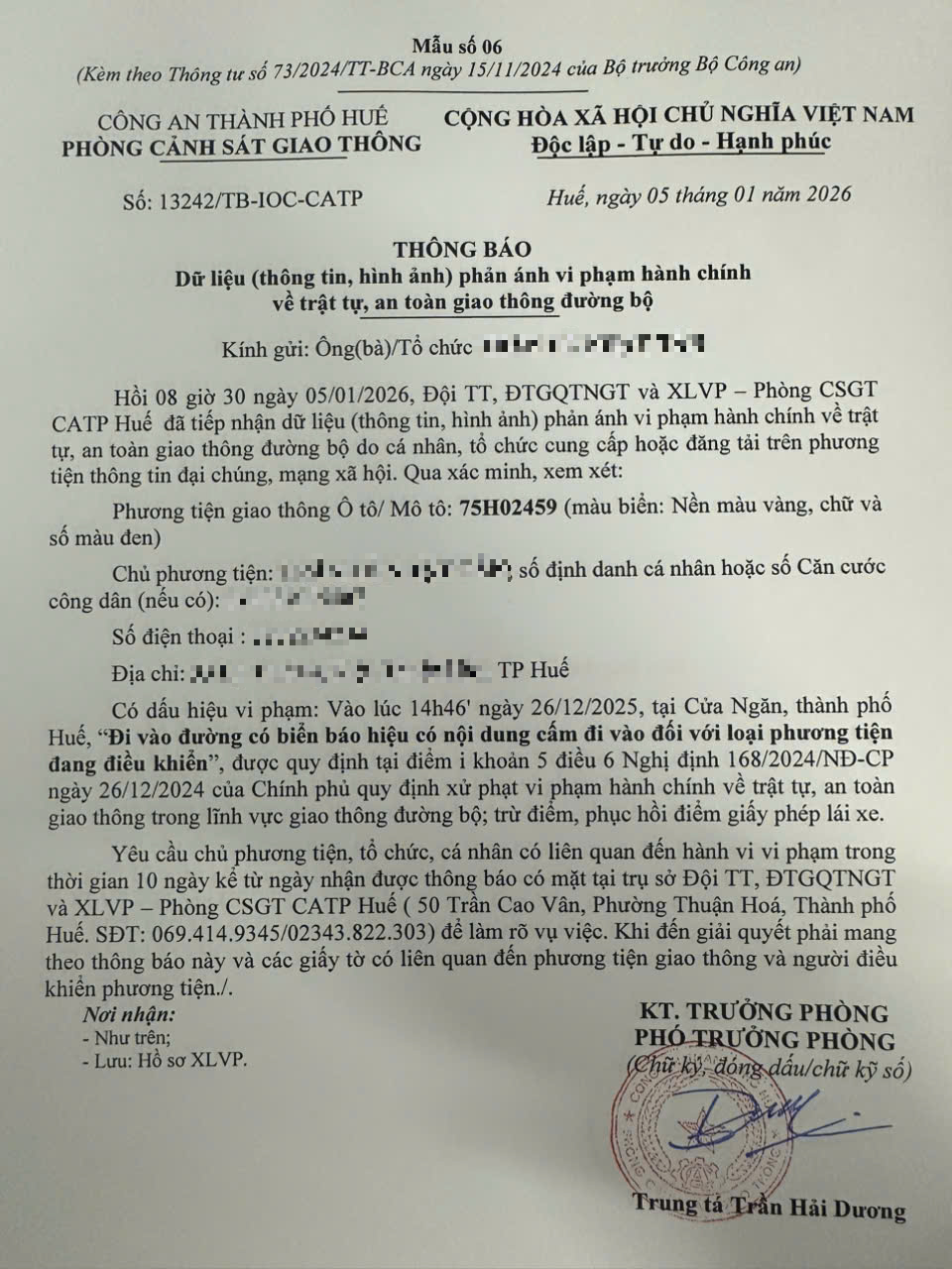 Qua hình ảnh phản ánh, Phòng Cảnh sát giao thông xác định lỗi vi phạm của người điều khiển phương tiện 75H02459 như sau: Đi vào đường có biển báo hiệu có nội dung cấm đi vào đối với loại phương tiện đang điều khiển, được quy định tại Điểm i khoản 5 Điều 6 Nghị định số 168/2024/NĐ-CP ngày 26/12/2024 của Chính phủ.