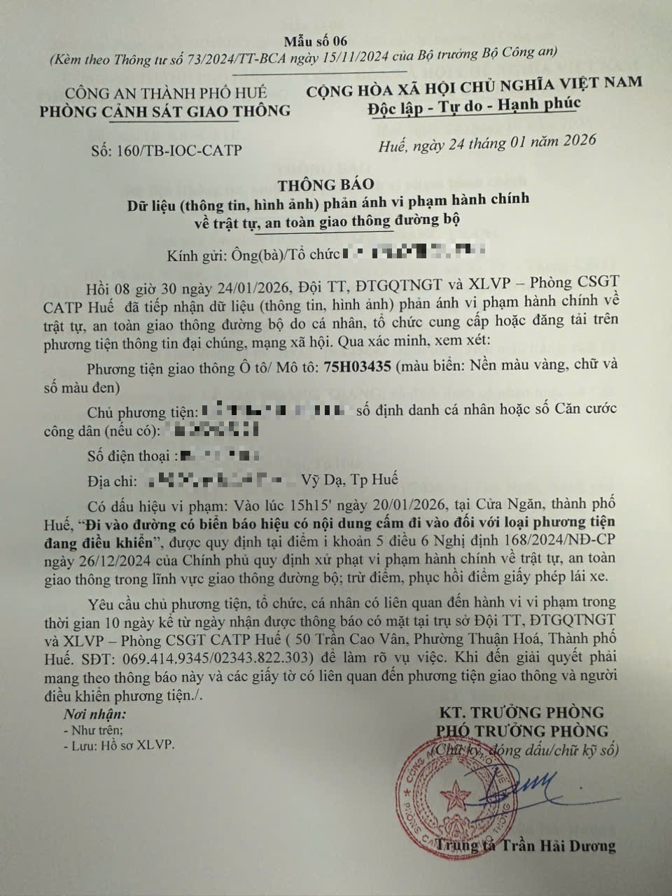 Qua hình ảnh phản ánh, Phòng Cảnh sát giao thông xác định lỗi vi phạm của người điều khiển phương tiện 75H03435 như sau: Đi vào đường có biển báo hiệu có nội dung cấm đi vào đối với loại phương tiện đang điều khiển, được quy định tại Điểm i khoản 5 Điều 6 Nghị định số 168/2024/NĐ-CP ngày 26/12/2024 của Chính phủ.
