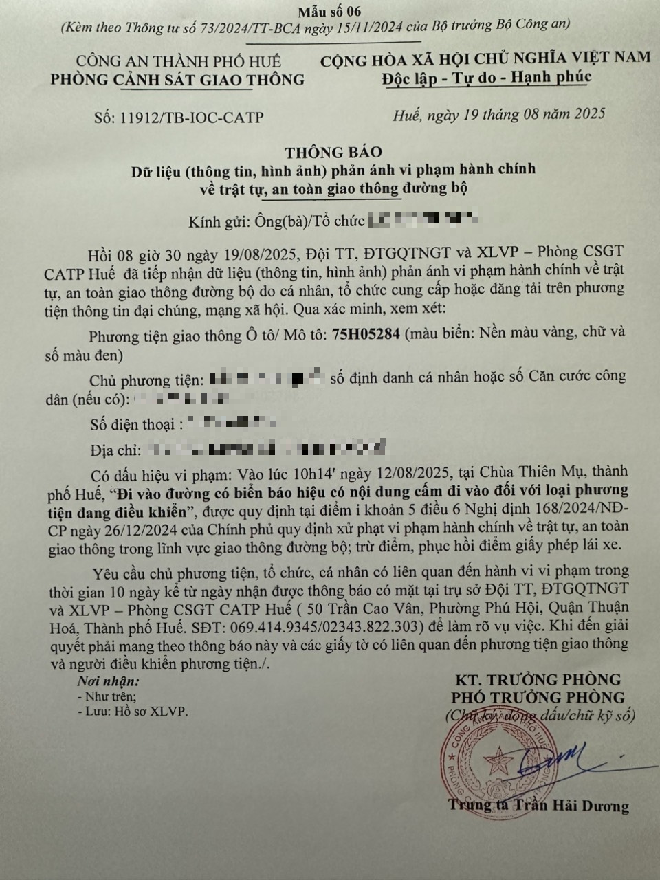 Qua hình ảnh phản ánh, Phòng Cảnh sát giao thông xác định lỗi vi phạm của người điều khiển phương tiện 75H05284 như sau: Đi vào đường có biển báo hiệu có nội dung cấm đi vào đối với loại phương tiện đang điều khiển, được quy định tại Điểm i khoản 5 Điều 6 Nghị định số 168/2024/NĐ-CP ngày 26/12/2024 của Chính phủ.