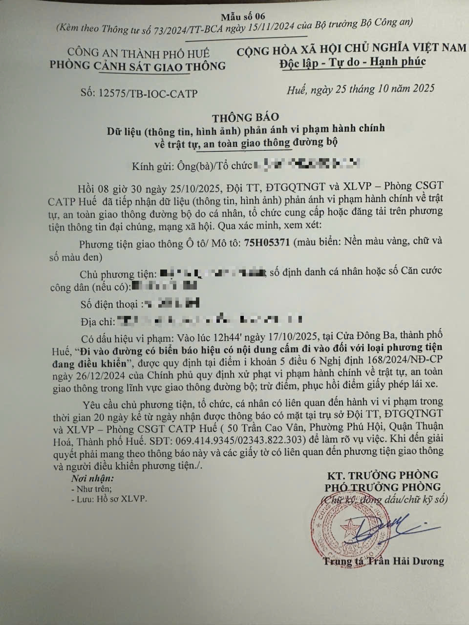 Qua hình ảnh phản ánh, Phòng Cảnh sát giao thông xác định lỗi vi phạm của người điều khiển phương tiện 75H05371 như sau: Đi vào đường có biển báo hiệu có nội dung cấm đi vào đối với loại phương tiện đang điều khiển, được quy định tại Điểm i khoản 5 Điều 6 Nghị định số 168/2024/NĐ-CP ngày 26/12/2024 của Chính phủ.