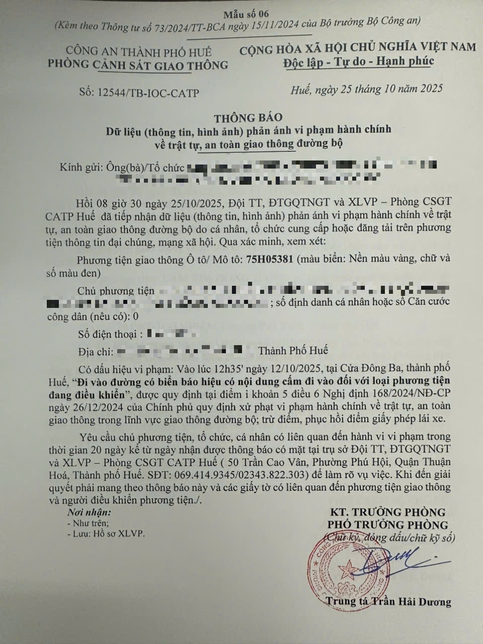 Qua hình ảnh phản ánh, người điều khiển phương tiện BKS 75H05381 có dấu hiệu vi phạm lỗi: Đi vào đường có biển báo hiệu có nội dung cấm đi vào đối với loại phương tiện đang điều khiển, quy định tại điểm i, khoản 5, điều 6 Nghị định số 168/2024/NĐ-CP ngày 26/12/2024 của Chính phủ quy định xử phạt vi phạm hành chính về trật tự, an toàn giao thông trong lĩnh vực giao thông đường bộ; trừ điểm, phục hồi điểm giấy phép lái xe.
