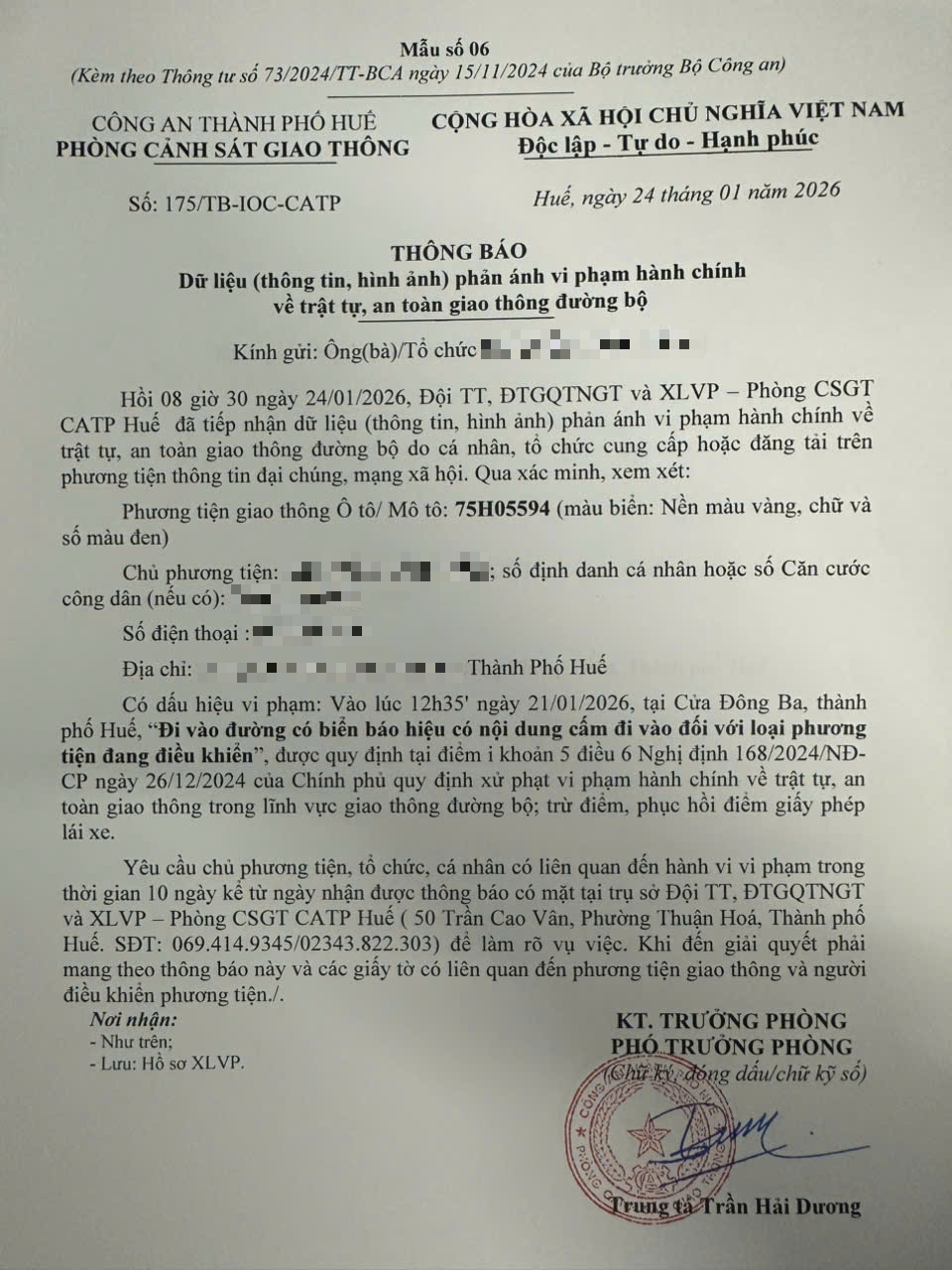 Qua hình ảnh phản ánh, người điều khiển phương tiện BKS 75H05594 có dấu hiệu vi phạm lỗi: Đi vào đường có biển báo hiệu có nội dung cấm đi vào đối với loại phương tiện đang điều khiển, quy định tại điểm i, khoản 5, điều 6 Nghị định số 168/2024/NĐ-CP ngày 26/12/2024 của Chính phủ quy định xử phạt vi phạm hành chính về trật tự, an toàn giao thông trong lĩnh vực giao thông đường bộ; trừ điểm, phục hồi điểm giấy phép lái xe.