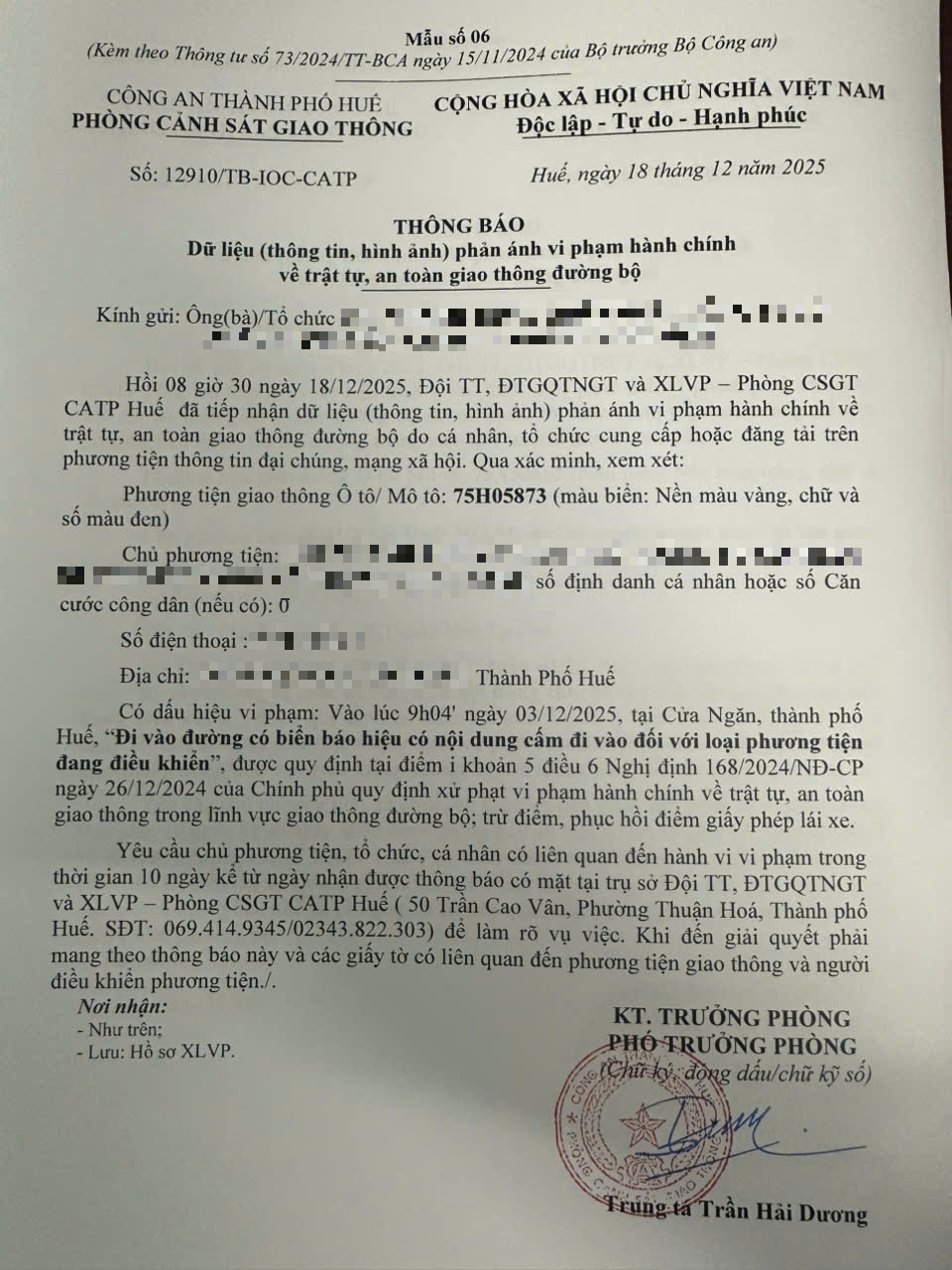 Qua hình ảnh phản ánh, Phòng Cảnh sát giao thông xác định lỗi vi phạm của người điều khiển phương tiện 75H05873 như sau: Đi vào đường có biển báo hiệu có nội dung cấm đi vào đối với loại phương tiện đang điều khiển, được quy định tại Điểm i khoản 5 Điều 6 Nghị định số 168/2024/NĐ-CP ngày 26/12/2024 của Chính phủ.
