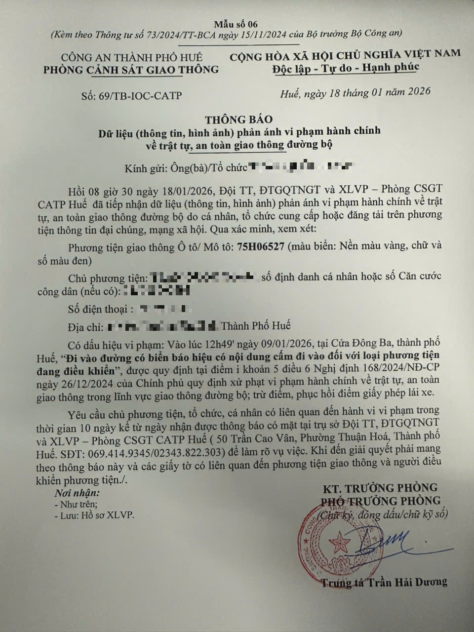 Qua hình ảnh phản ánh, Phòng Cảnh sát giao thông xác định lỗi vi phạm của người điều khiển phương tiện 75H06527 như sau: Đi vào đường có biển báo hiệu có nội dung cấm đi vào đối với loại phương tiện đang điều khiển, được quy định tại Điểm i khoản 5 Điều 6 Nghị định số 168/2024/NĐ-CP ngày 26/12/2024 của Chính phủ.