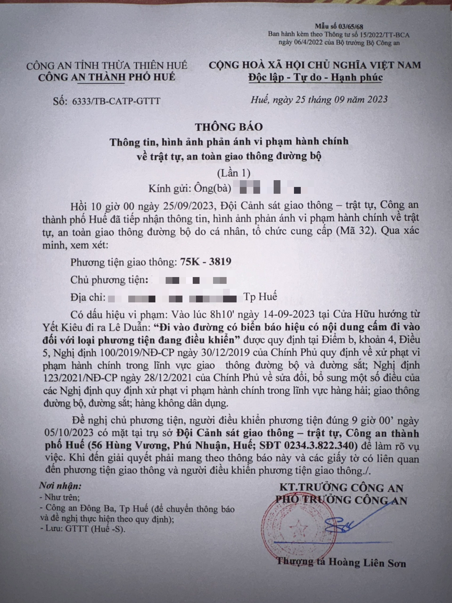 Vấn đề Ông/Bà phản ánh, Công an tỉnh đã chỉ đạo Công an thành phố Huế xác minh và xin thông báo kết quả như sau: