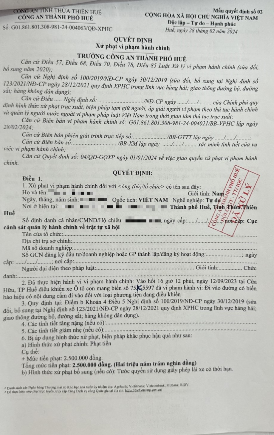 Công an thành phố cập nhật Quyết định xử phạt. (Đính kèm QĐ)