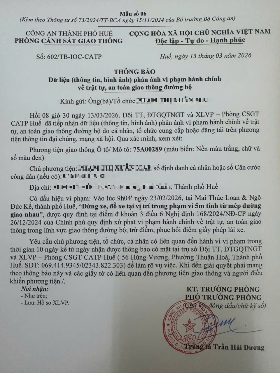 Qua hình ảnh phản ánh, người điều khiển phương tiện BKS 75A00289 có dấu hiệu vi phạm lỗi: “Dừng xe, đỗ xe tại vị trí trong phạm vi 5m tính từ mép đường giao nhau”, quy định tại điểm đ, khoản 3, điều 6 Nghị định 168/2024/NĐ-CP.