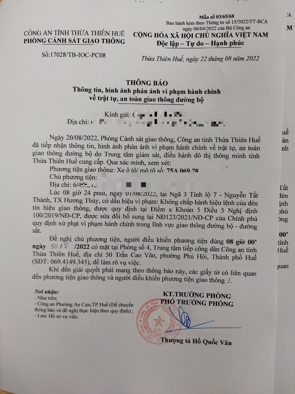 Vào lúc 08 giờ 24 phút, ngày 01/08/2022 Ô tô mang biển kiểm soát 75A06978 Không chấp hành hiệu lệnh của đèn tín hiệu giao thông tại địa điểm Ngã 3 Tỉnh lộ 7 - Nguyễn Tất Thành