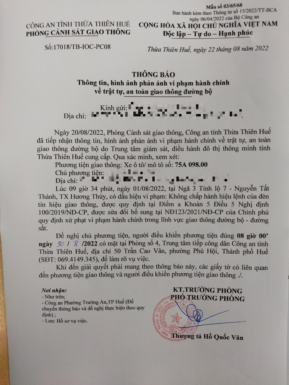 Phòng Cảnh sát giao thông đã lập hồ sơ, thông báo chủ phương tiện làm việc vào ngày 30/8/2022. Tuy nhiên, hiện chủ phương tiện vẫn chưa trình diện tại cơ quan. Phòng Cảnh sát giao thông sẽ gửi thông báo cho cơ quan đăng kiểm để đưa phương tiện vào cảnh báo trên Chương trình Quản lý kiểm định.
