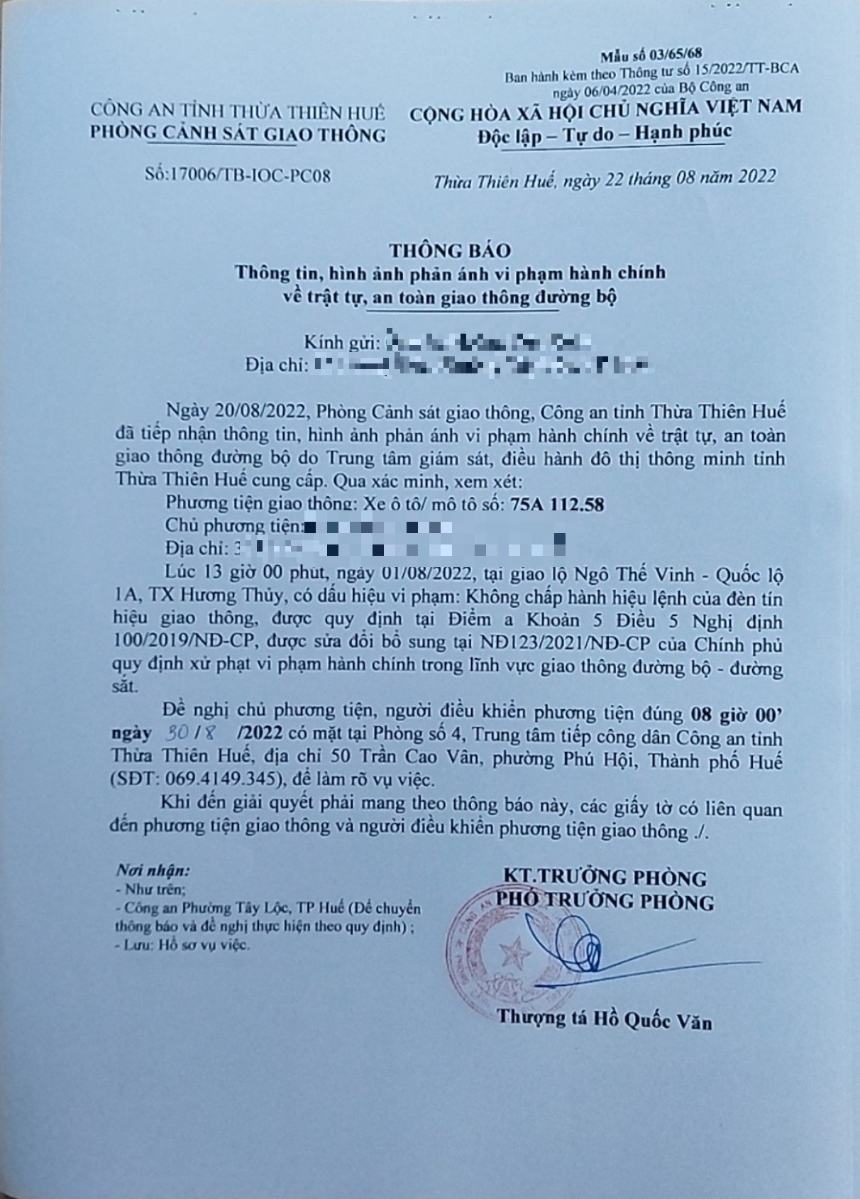 Phòng Cảnh sát giao thông đã lập hồ sơ, thông báo chủ phương tiện làm việc vào ngày 30/8/2022. Tuy nhiên, hiện chủ phương tiện vẫn chưa trình diện tại cơ quan. Phòng Cảnh sát giao thông sẽ gửi thông báo cho cơ quan đăng kiểm để đưa phương tiện vào cảnh báo trên Chương trình Quản lý kiểm định.