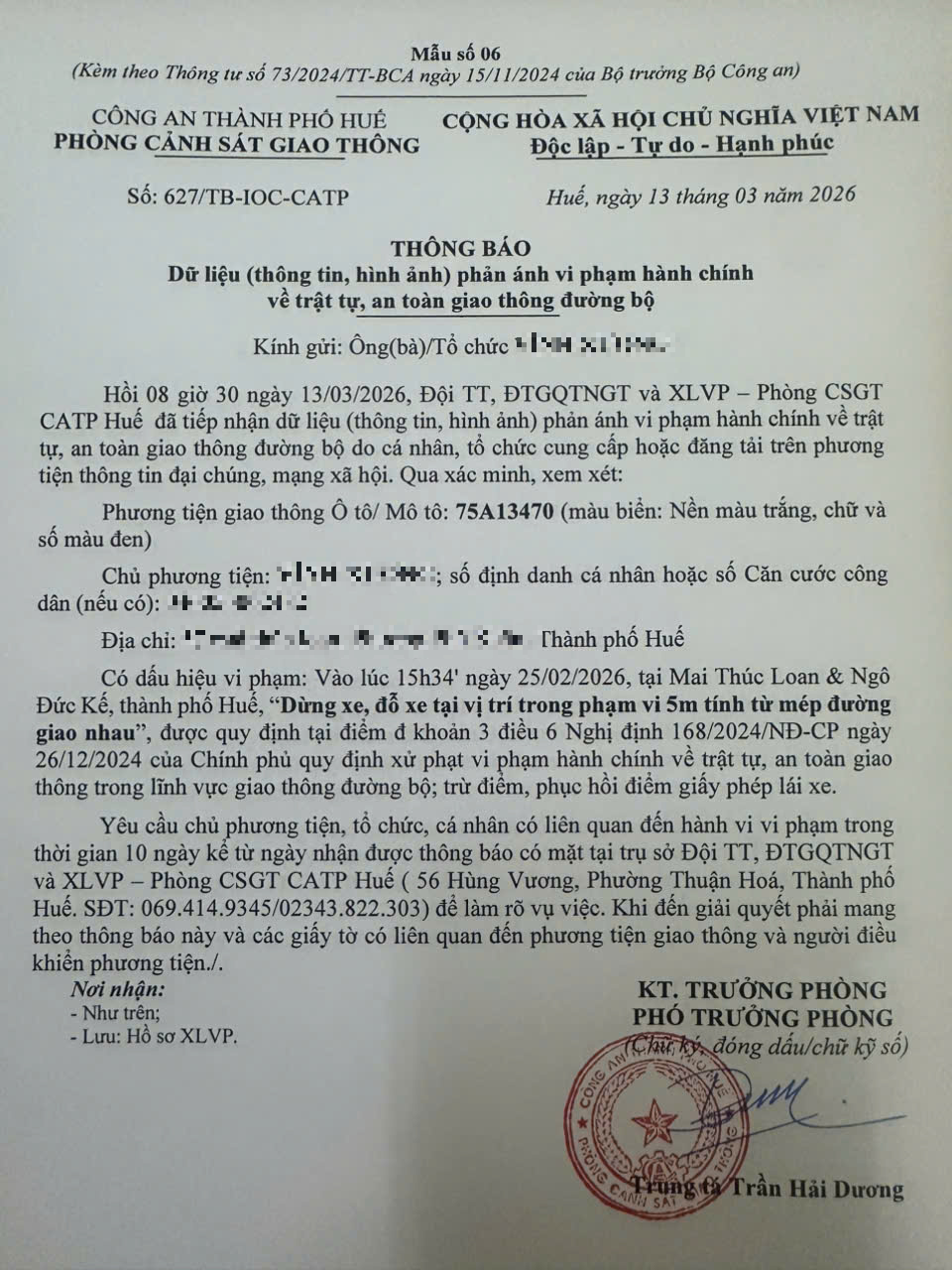 Qua hình ảnh phản ánh, người điều khiển phương tiện BKS 75A13470 có dấu hiệu vi phạm lỗi: “Dừng xe, đỗ xe tại vị trí trong phạm vi 5m tính từ mép đường giao nhau”, quy định tại điểm đ, khoản 3, điều 6 Nghị định số 168/2024/NĐ-CP ngày 26/12/2024 của Chính phủ quy định xử phạt vi phạm hành chính về trật tự, an toàn giao thông trong lĩnh vực giao thông đường bộ; trừ điểm, phục hồi điểm giấy phép lái xe.