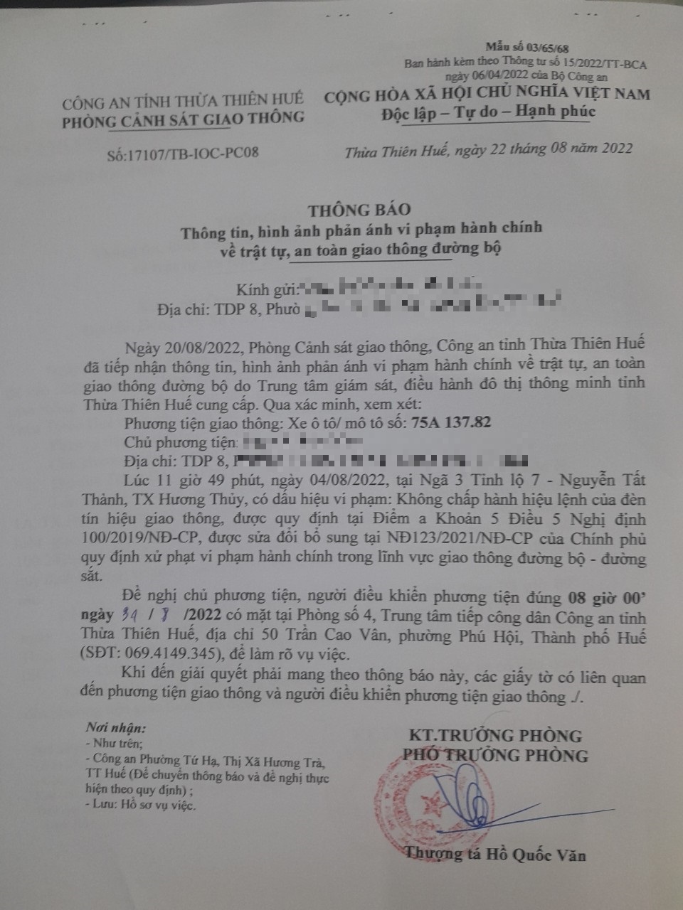 Vào lúc 11 giờ 49 phút, ngày 04/08/2022 Ô tô mang biển kiểm soát 75A13782 Không chấp hành hiệu lệnh của đèn tín hiệu giao thông tại địa điểm Ngã 3 Tỉnh lộ 7 - Nguyễn Tất Thành