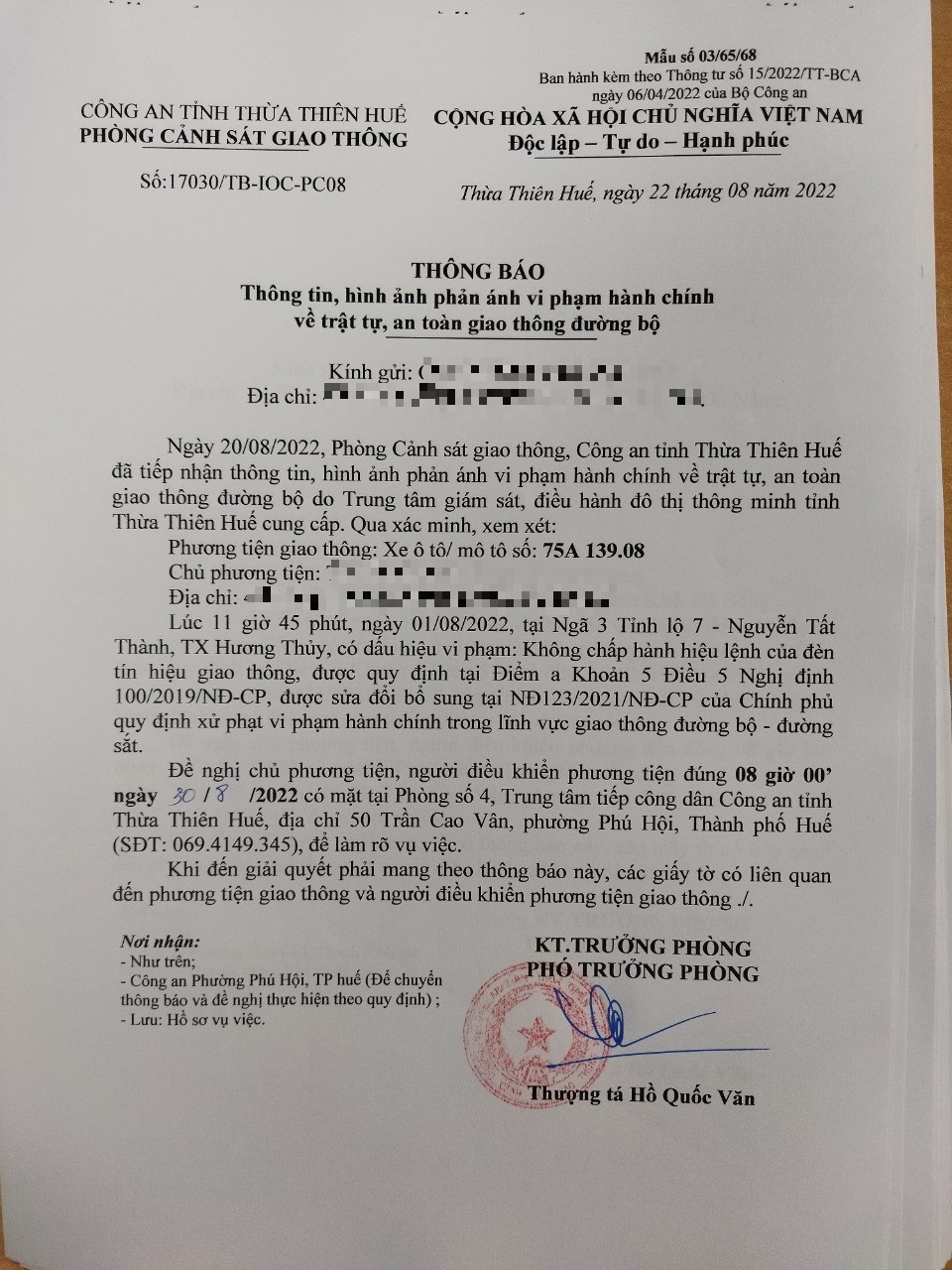 Vào lúc 11 giờ 45 phút, ngày 01/08/2022 Ô tô mang biển kiểm soát 75A13908 Không chấp hành hiệu lệnh của đèn tín hiệu giao thông tại địa điểm Ngã 3 Tỉnh lộ 7 - Nguyễn Tất Thành