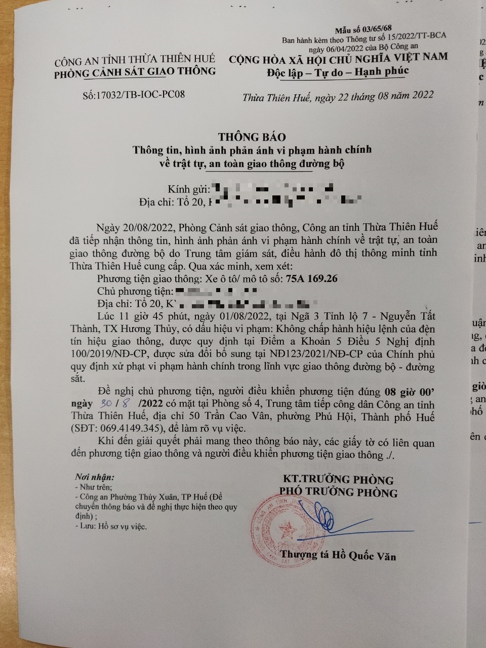 Vào lúc 11 giờ 45 phút, ngày 01/08/2022 Ô tô mang biển kiểm soát 75A16926 Không chấp hành hiệu lệnh của đèn tín hiệu giao thông tại địa điểm Ngã 3 Tỉnh lộ 7 - Nguyễn Tất Thành