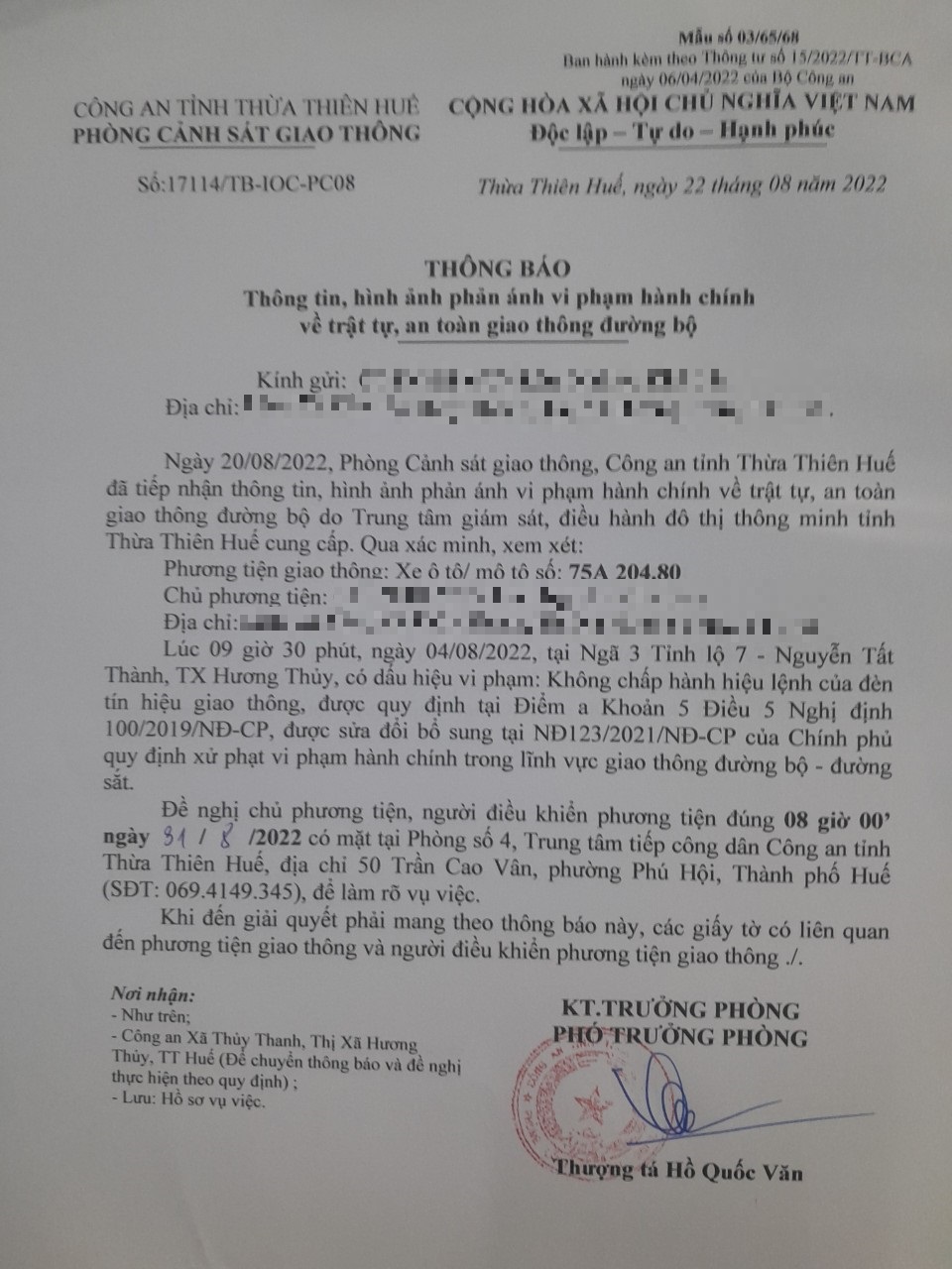 Vào lúc 09 giờ 30 phút, ngày 04/08/2022 Ô tô mang biển kiểm soát 75A20480 Không chấp hành hiệu lệnh của đèn tín hiệu giao thông tại địa điểm Ngã 3 Tỉnh lộ 7 - Nguyễn Tất Thành