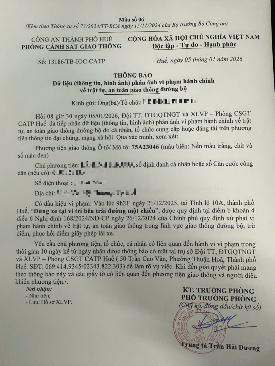 Qua hình ảnh phản ánh, Phòng Cảnh sát giao thông xác định lỗi vi phạm của người điều khiển phương tiện 75A23046 như sau: Dừng xe tại vị trí bên trái đường một chiều, quy định tại điểm b, khoản 4, điều 6 Nghị định 168/2024/NĐ-CP.