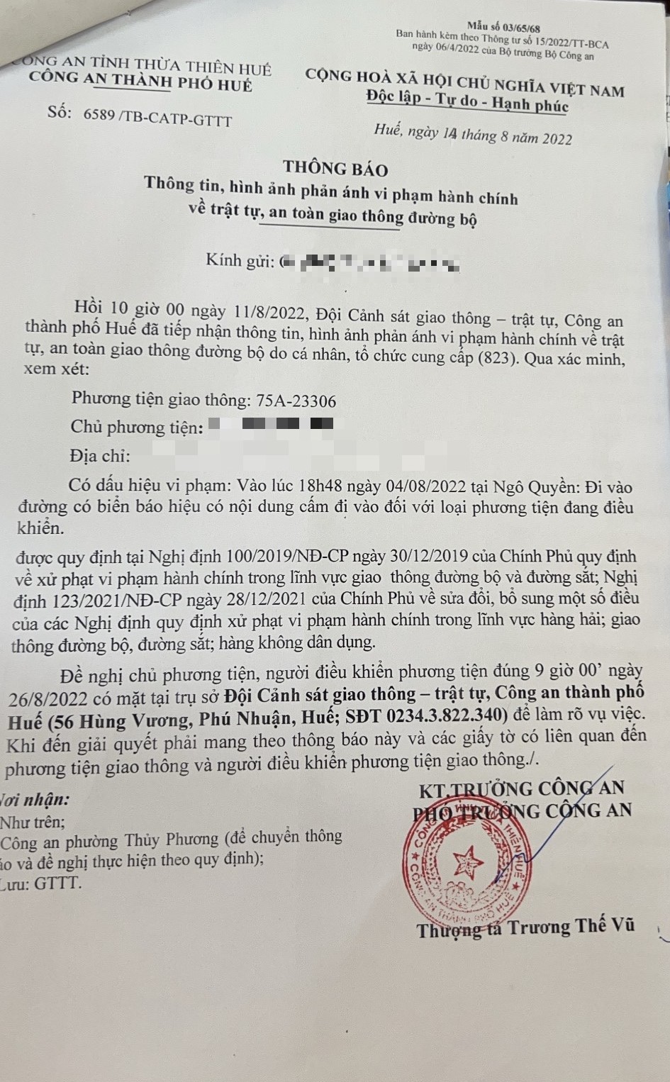 Công an thành phố đã lập hồ sơ, thông báo chủ phương tiện đến làm việc vào ngày 26/8/2022. Tuy nhiên, hiện chủ phương tiện vẫn chưa trình diện tại cơ quan. Công an thành phố sẽ gửi thông báo cho cơ quan đăng kiểm để đưa phương tiện vào cảnh báo trên Chương trình Quản lý kiểm định.