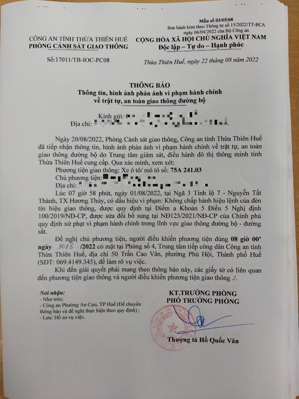 Phòng Cảnh sát giao thông đã lập hồ sơ, thông báo chủ phương tiện làm việc vào ngày 30/8/2022. Tuy nhiên, hiện chủ phương tiện vẫn chưa trình diện tại cơ quan. Phòng Cảnh sát giao thông sẽ gửi thông báo cho cơ quan đăng kiểm để đưa phương tiện vào cảnh báo trên Chương trình Quản lý kiểm định.