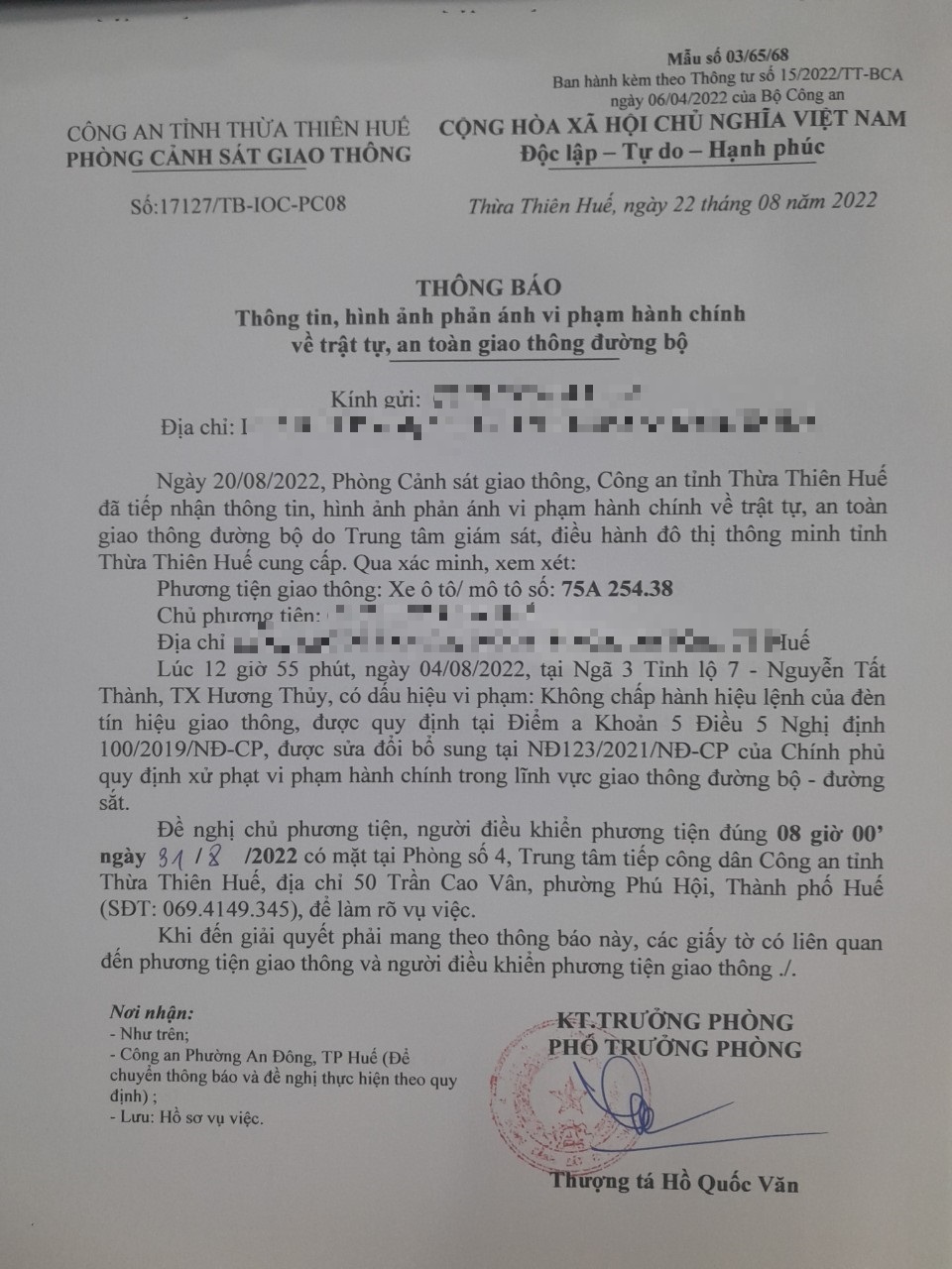 Vào lúc 12 giờ 55 phút, ngày 04/08/2022 Ô tô mang biển kiểm soát 75A25438 Không chấp hành hiệu lệnh của đèn tín hiệu giao thông tại địa điểm Ngã 3 Tỉnh lộ 7 - Nguyễn Tất Thành