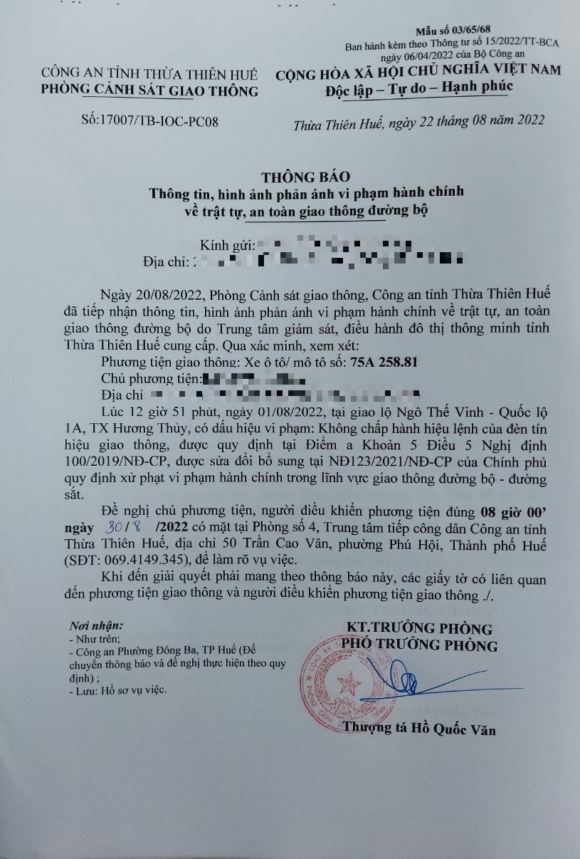 Phòng Cảnh sát giao thông đã lập hồ sơ, thông báo chủ phương tiện làm việc vào ngày 30/8/2022. Tuy nhiên, hiện chủ phương tiện vẫn chưa trình diện tại cơ quan. Phòng Cảnh sát giao thông sẽ gửi thông báo cho cơ quan đăng kiểm để đưa phương tiện vào cảnh báo trên Chương trình Quản lý kiểm định.