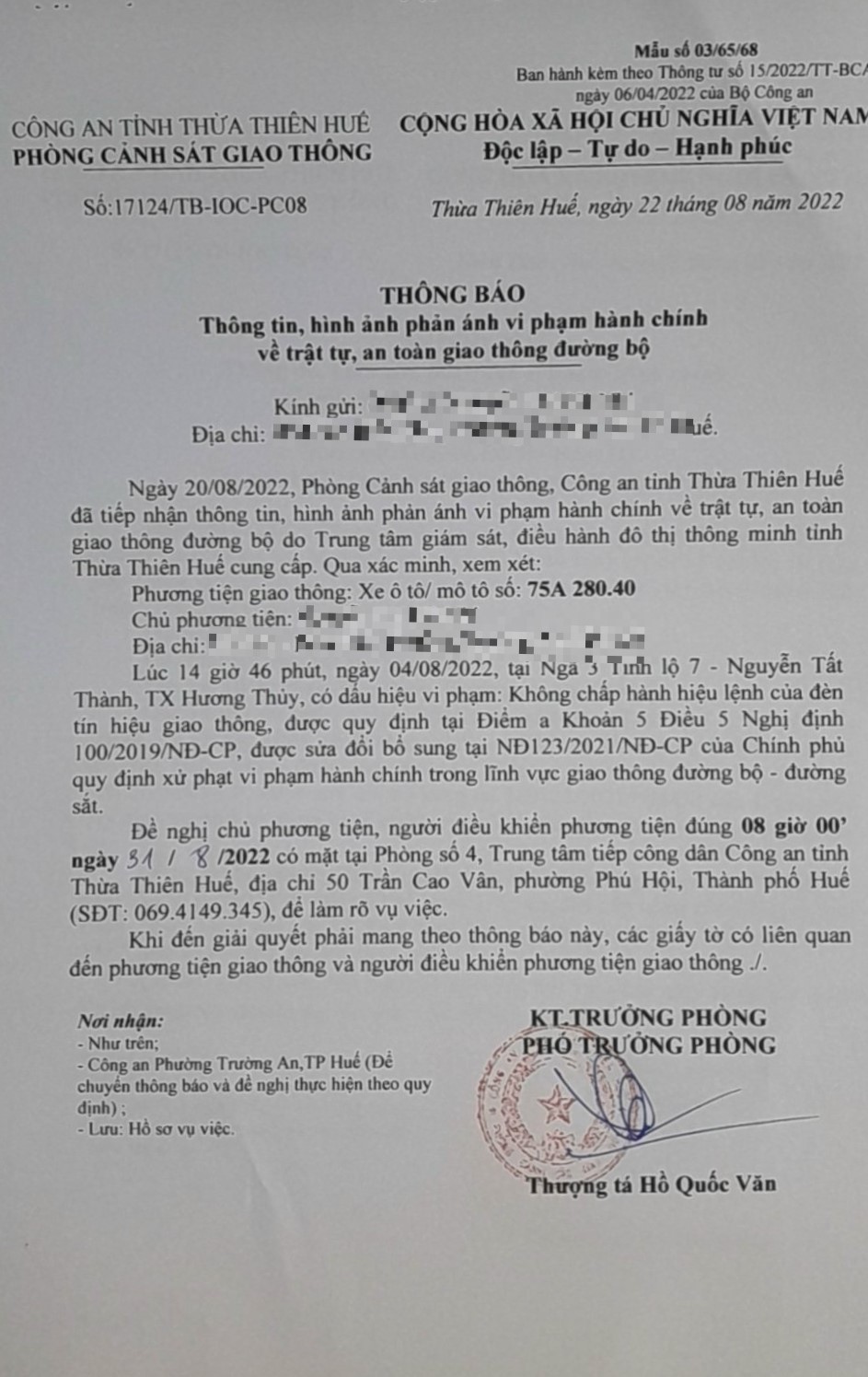 Phòng Cảnh sát giao thông đã lập hồ sơ, thông báo chủ phương tiện làm việc vào ngày 31/8/2022. Tuy nhiên, hiện chủ phương tiện vẫn chưa trình diện tại cơ quan. Phòng Cảnh sát giao thông sẽ gửi thông báo cho cơ quan đăng kiểm để đưa phương tiện vào cảnh báo trên Chương trình Quản lý kiểm định.