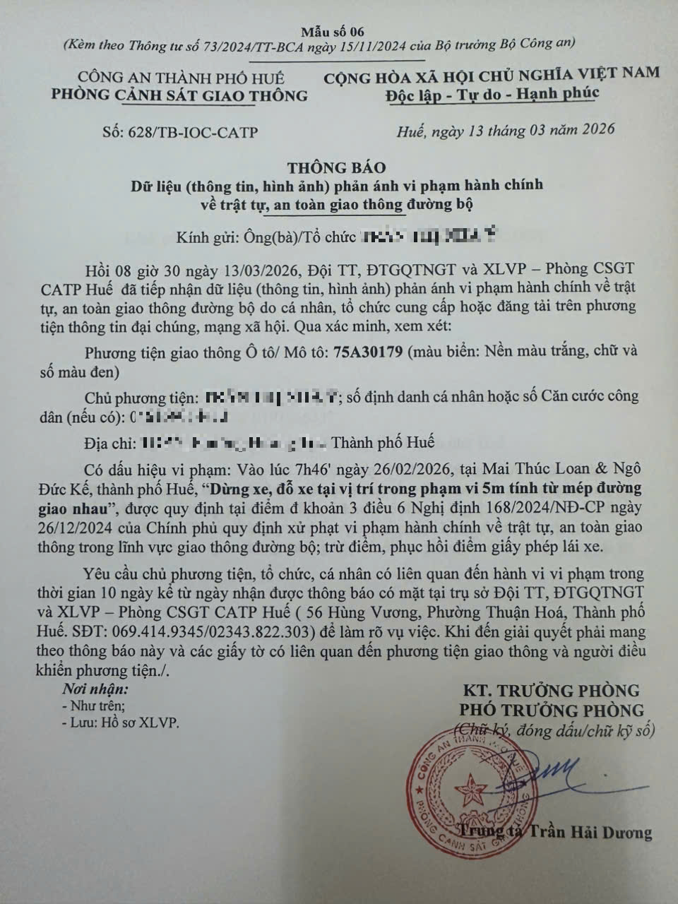 Qua hình ảnh phản ánh, người điều khiển phương tiện BKS 75A30179 có dấu hiệu vi phạm lỗi: “Dừng xe, đỗ xe tại vị trí trong phạm vi 5m tính từ mép đường giao nhau”, quy định tại điểm đ, khoản 3, điều 6 Nghị định số 168/2024/NĐ-CP ngày 26/12/2024 của Chính phủ quy định xử phạt vi phạm hành chính về trật tự, an toàn giao thông trong lĩnh vực giao thông đường bộ; trừ điểm, phục hồi điểm giấy phép lái xe.