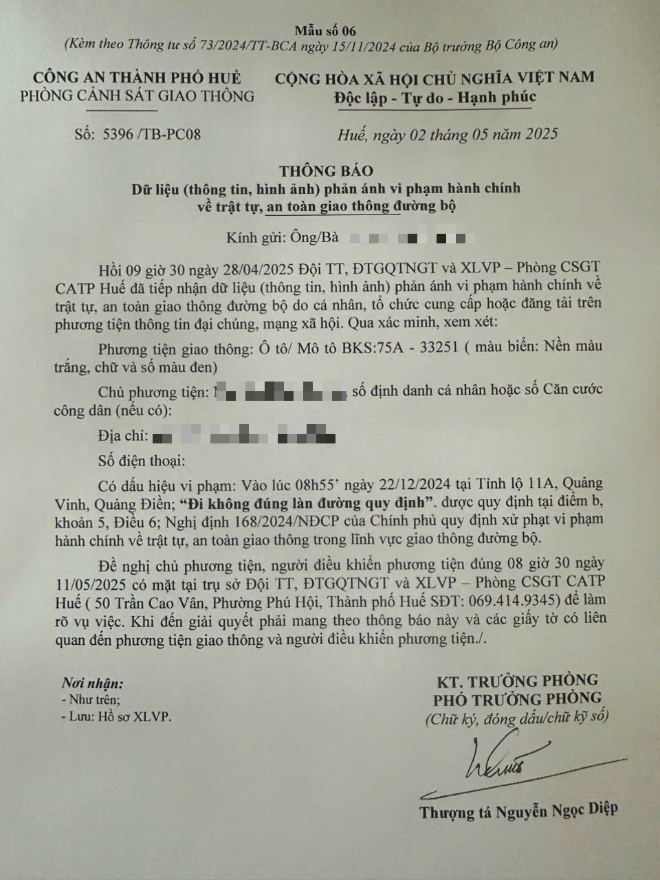 Phòng Cảnh sát giao thông đã gửi thông báo yêu cầu chủ phương tiện đến làm việc theo quy định của pháp luật. Tuy nhiên, đến nay, chủ phương tiện vẫn chưa đến làm việc theo ngày hẹn như yêu cầu. Phòng Cảnh sát giao thông sẽ tiến hành gửi thông báo cho cơ quan đăng kiểm để đưa vào cảnh báo trên Chương trình Quản lý kiểm định.