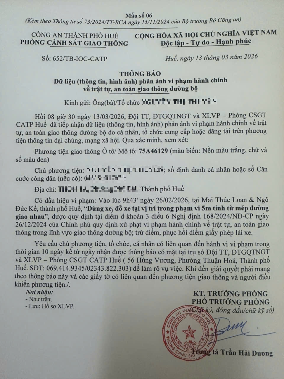 Qua hình ảnh phản ánh, Phòng Cảnh sát giao thông xác định lỗi vi phạm của người điều khiển phương tiện 75A46129 như sau: “Dừng xe, đỗ xe tại vị trí trong phạm vi 5m tính từ mép đường giao nhau”, quy định tại điểm đ, khoản 3, điều 6 Nghị định 168/2024/NĐ-CP.
