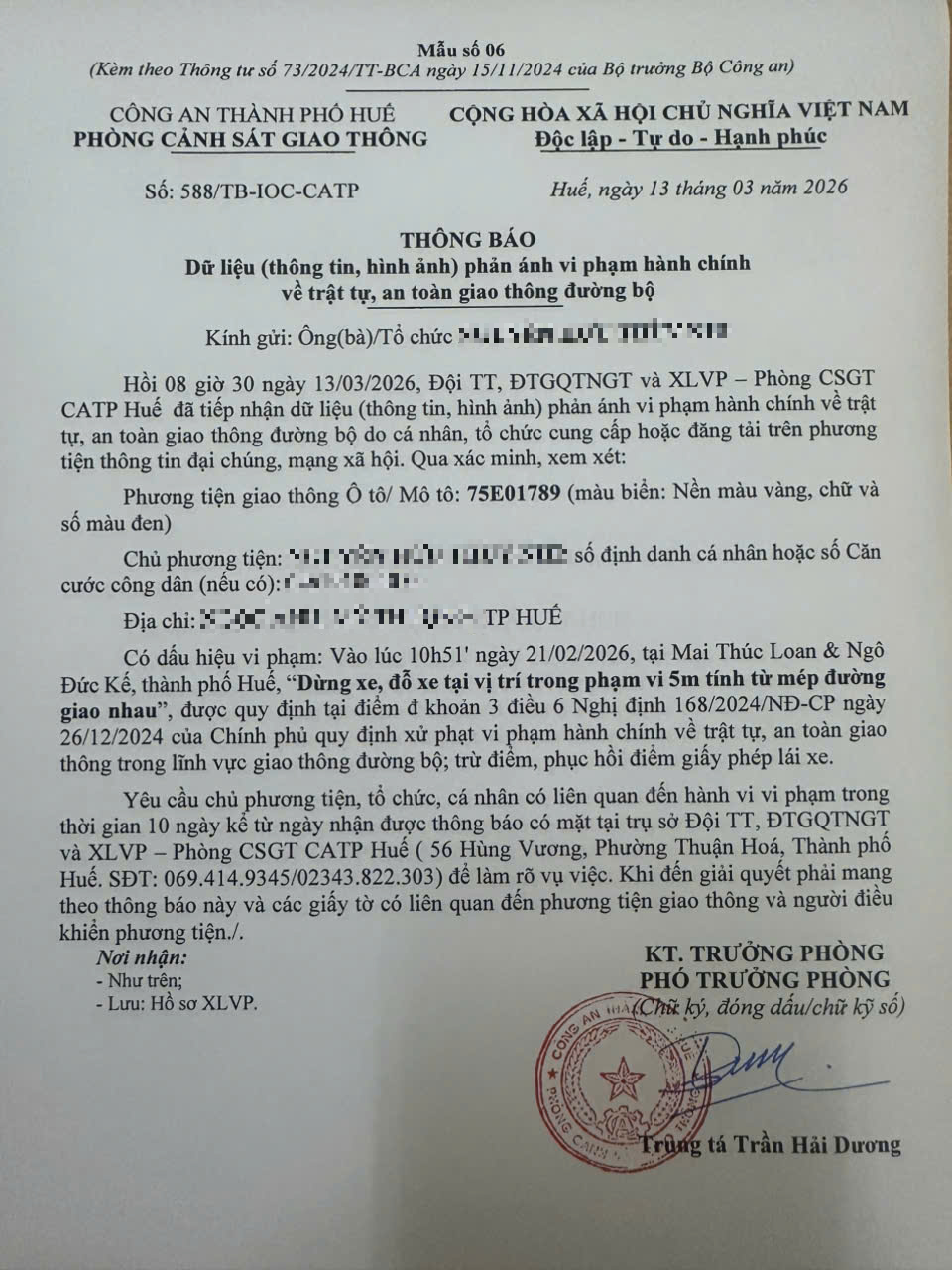 Qua hình ảnh phản ánh, người điều khiển phương tiện BKS 75E01789 có dấu hiệu vi phạm lỗi: “Dừng xe, đỗ xe tại vị trí trong phạm vi 5m tính từ mép đường giao nhau”, quy định tại điểm đ, khoản 3, điều 6 Nghị định 168/2024/NĐ-CP.