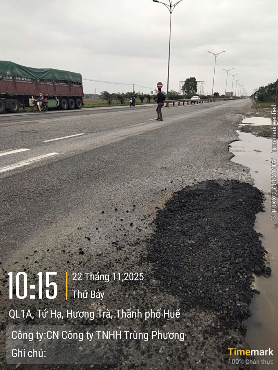 Vào lúc 04h52 tại Km 809+700 QL1A (đường Cách mạng Tháng 8, Phường Hương Trà, Thành Phố Huế, làn đường trong cùng bên Phải, hướng Nam-Bắc có nhiều ổ voi, đọng nước, rất nguy hiểm khi nhiều xe máy đi vào, té ngã.