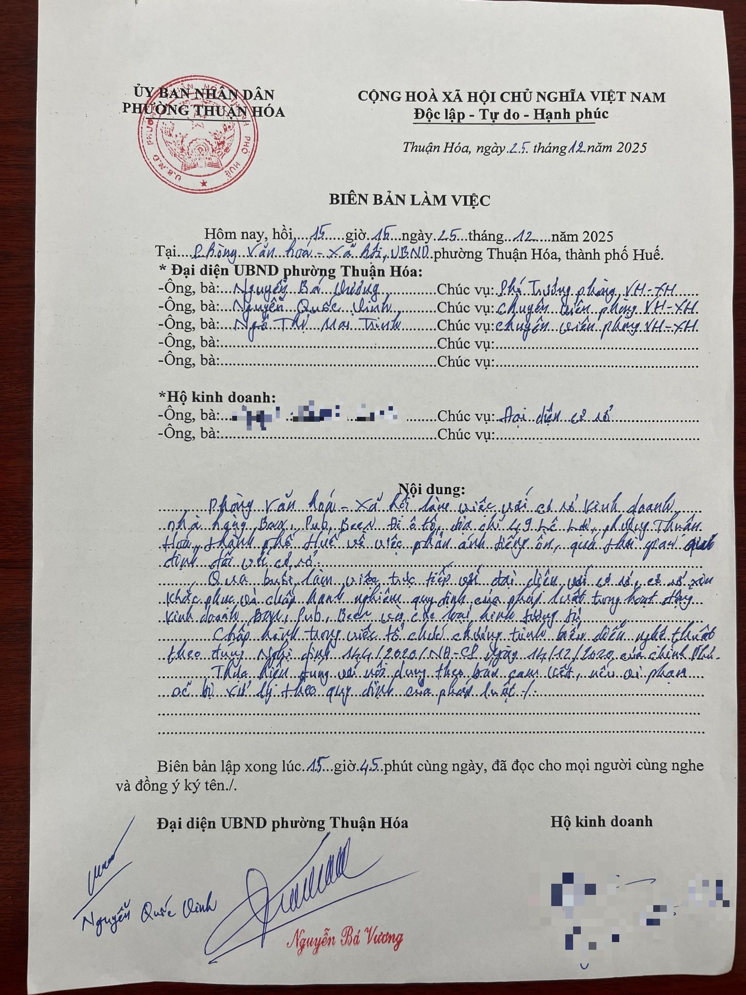 Đối với nội dung phản ánh trên, UBND phường đã chỉ đạo các đơn vị liên quan kiểm tra để xử lý. Ngày 25/12/2025 UBND phường đã mời chủ cơ sở để làm việc đối với nội dung trên. Qua đó UBND phường tuyên truyền, nhắc nhở chủ cơ sở thực hiện đúng các quy định pháp luật , đảm bảo sự yên tĩnh chung tại khu vực dân cư.