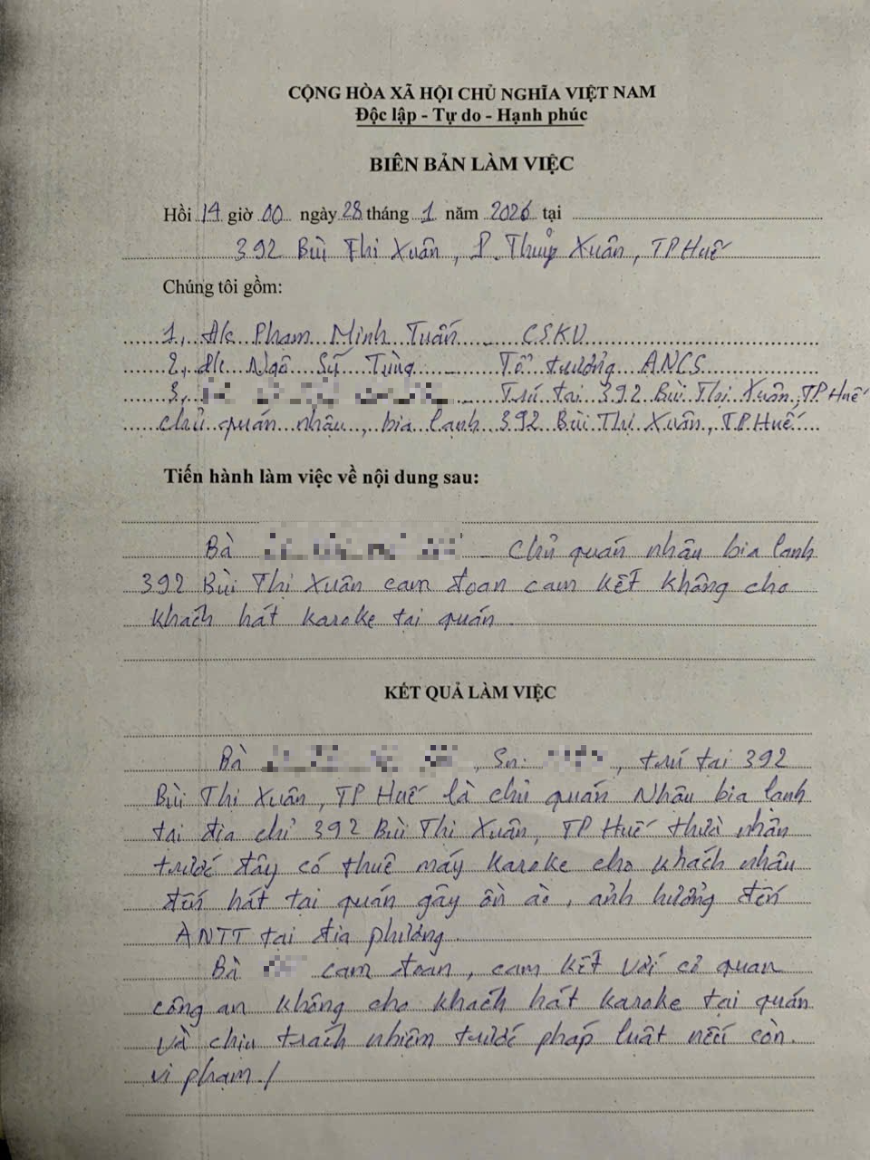 Sau khi tiếp nhận phản ánh, UBND phường đã giao Công an phường Thủy Xuân chỉ đạo Cảnh sát khu vực làm việc với hộ gia đình bà L.T.H.Y. Qua làm việc, yêu cầu hộ gia đình bà L.T.H.Y thực hiện hoạt động buôn bán đảm bảo an ninh, trật tự và vệ sinh môi trường. Trường hợp không chấp hành, sẽ bị xử lý theo quy định của pháp luật. (Đính kèm biên bản làm việc và bản cam kết).
