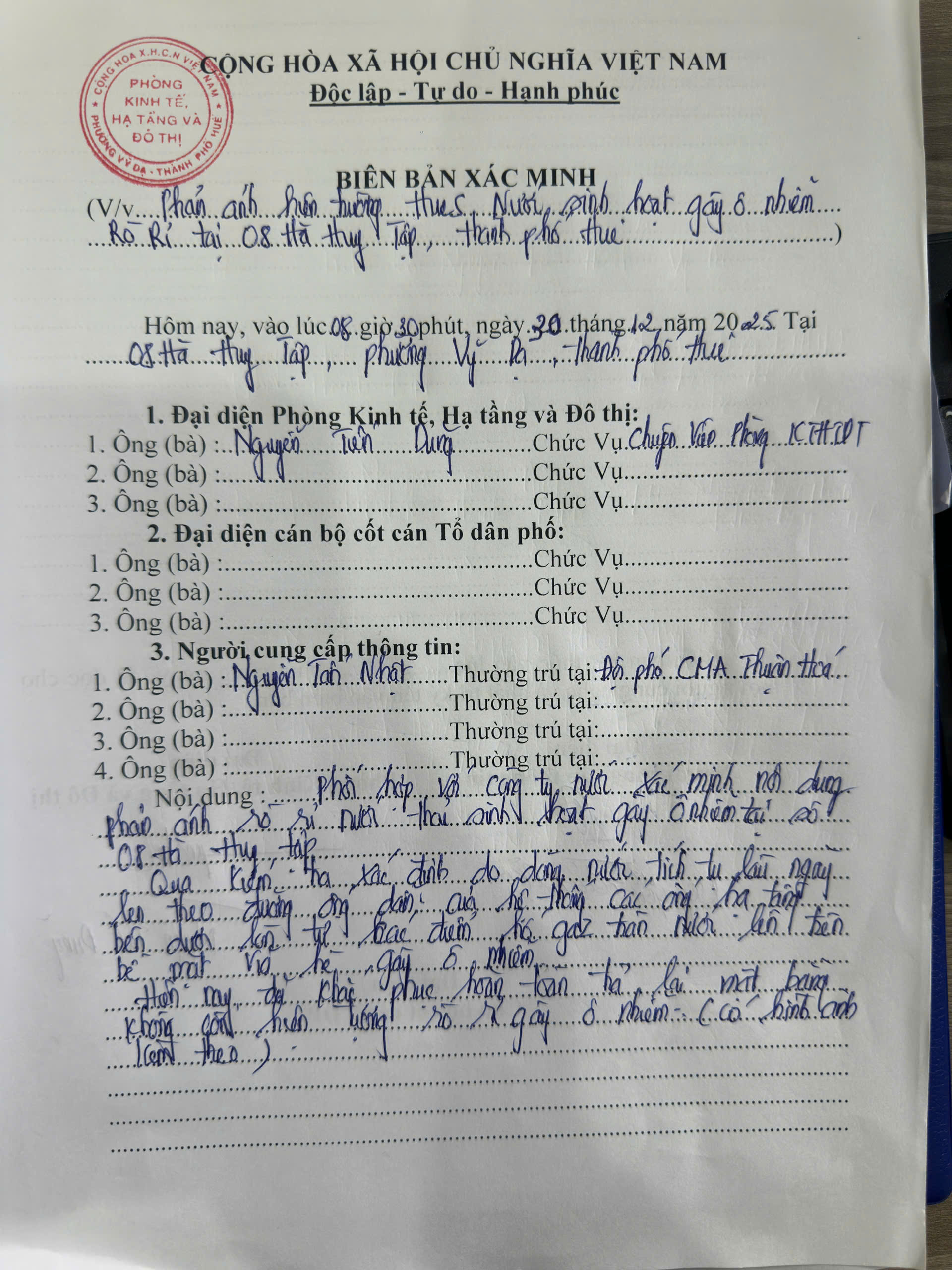 Qua kiểm tra tại hiện trường, UBND phường đã phối hợp với Công ty cấp nước Thành phố Huế xác định do nước tích tụ lâu ngày len theo đường ống dẫn của hệ thống các ống hạ tầng đến các điểm hố ga làm nước tràn lên trên bề mặt vỉa hè, gây ô nhiễm. Hiện nay đã khắc phục hoàn toàn trả lại mặt bằng không còn hiện tượng rò rỉ gây ô nhiễm. (Đính kèm Biên bản và hình ảnh)
