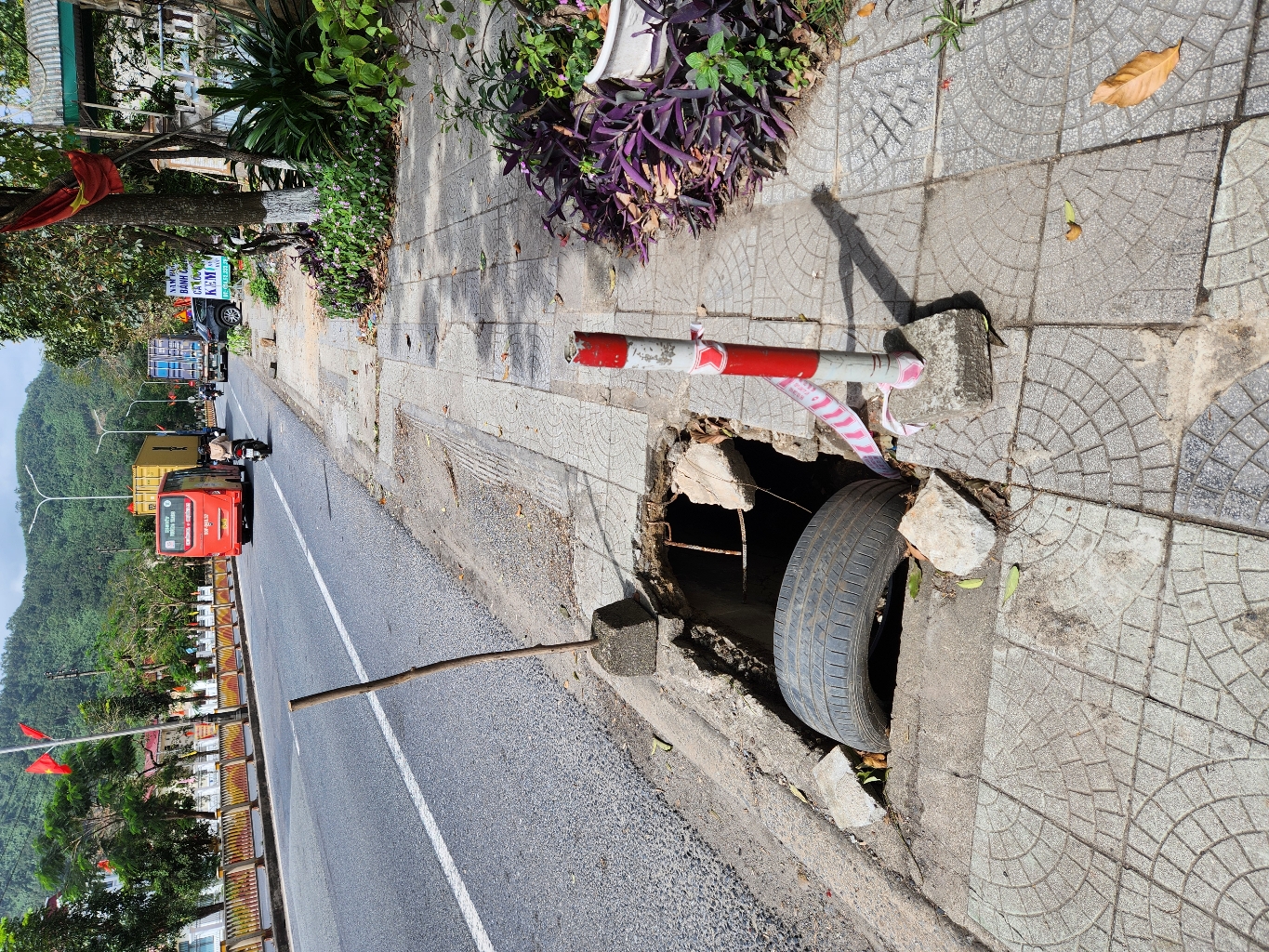 Sập miệng cống thoát nước tại trước số nhà 268 Lý Thánh Tông, xã Phú Lộc, thành phố Huế. Gây nguy hiểm cho người đi bộ trên vỉa hè.