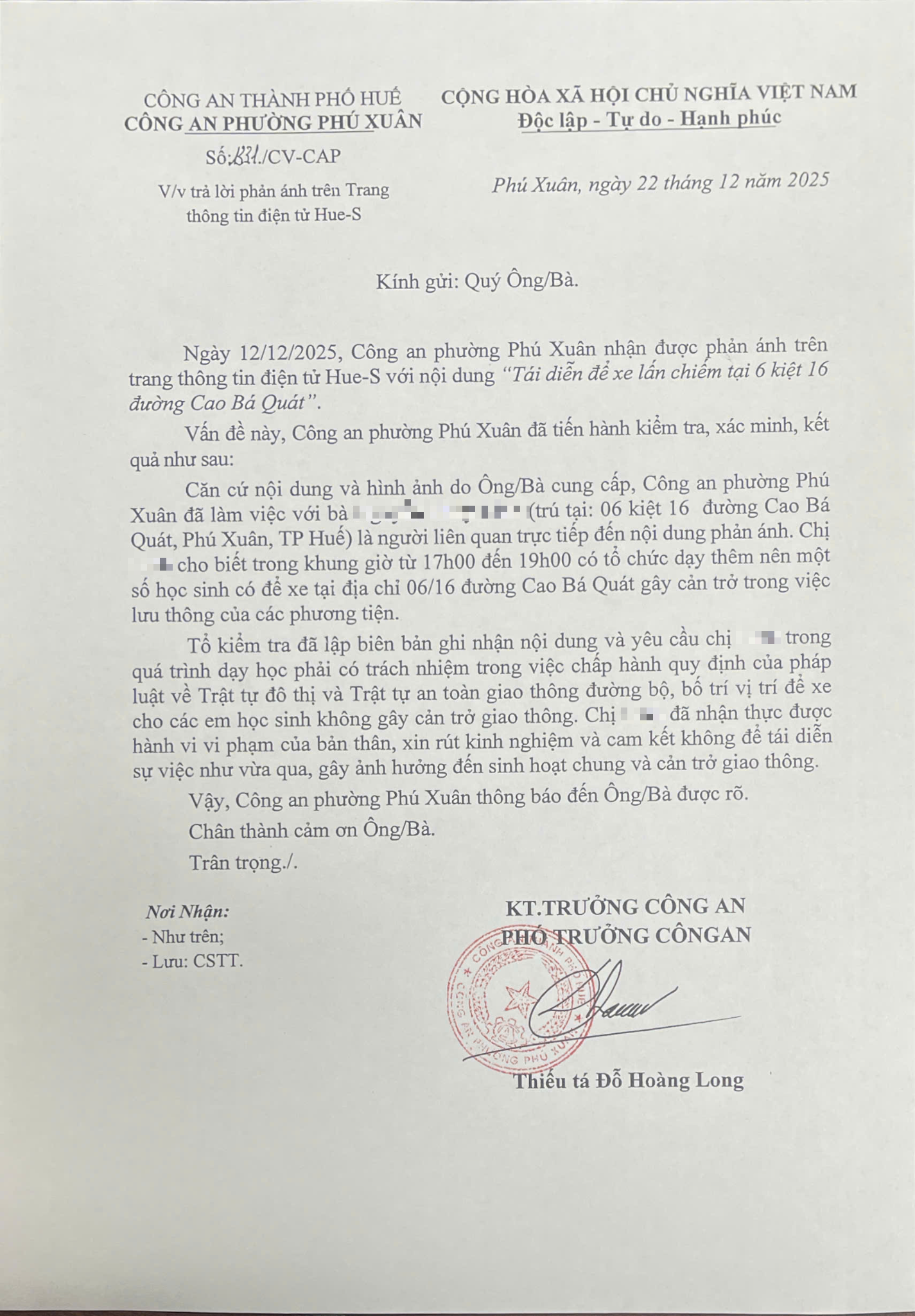 Sau khi tiến hành kiểm tra, xác minh, Công an phường đã làm việc với bà N.T.L (trú tại số 06, kiệt 16, đường Cao Bá Quát), là người có liên quan trực tiếp đến nội dung phản ánh. Tổ kiểm tra đã lập biên bản làm việc và yêu cầu hộ gia đình cam kết không để tái diễn sự việc tương tự, gây ảnh hưởng đến sinh hoạt chung và cản trở giao thông.